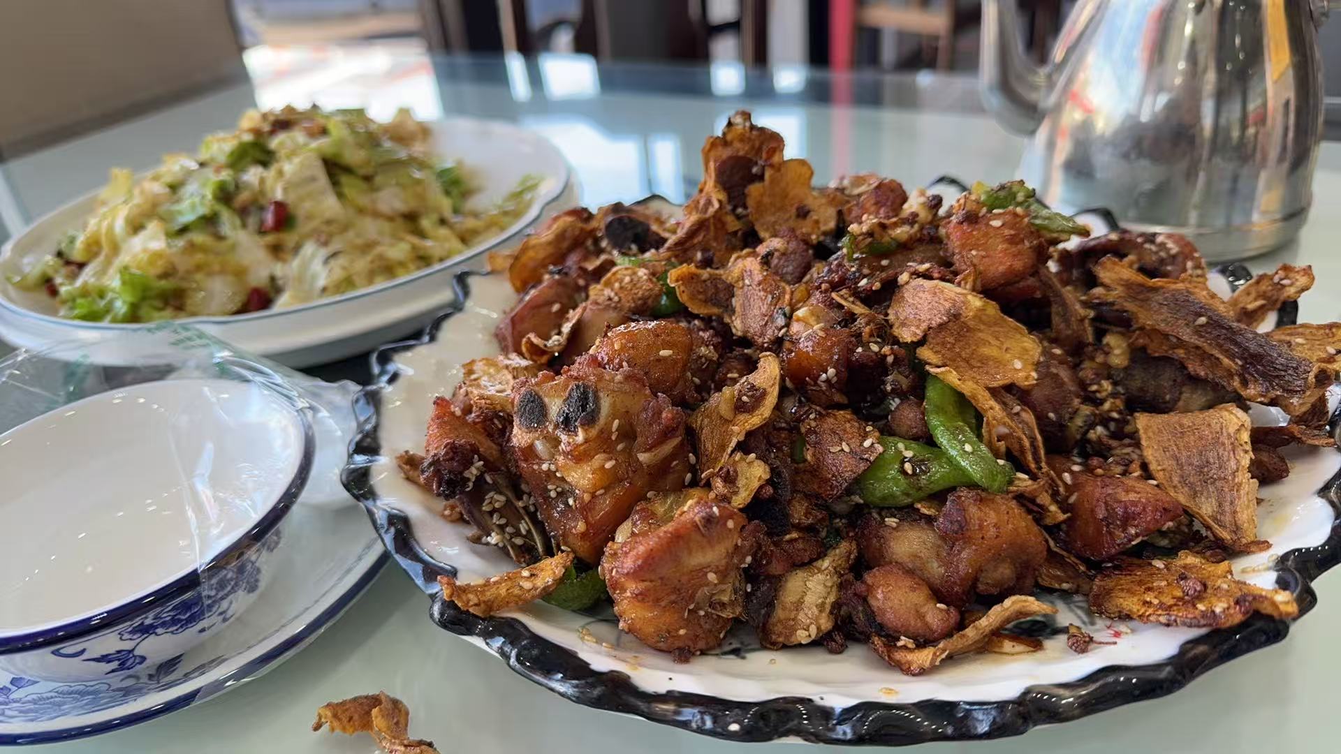 在山脚下,又吃了一份当地特色的炒鸡。这边的炒鸡做法,基本上都是炖熟后,在油锅里再炸一遍,达到外酥里嫩的口感。跟四川的辣子鸡丁做法差不多,区别就是没有干辣椒。山东人就是豪爽,点的是小份,结果上了一大盘,根本吃不完。吃的时候感觉里面科技狠活有点多,我用茶汤把鸡肉涮了再吃,都觉得咸。