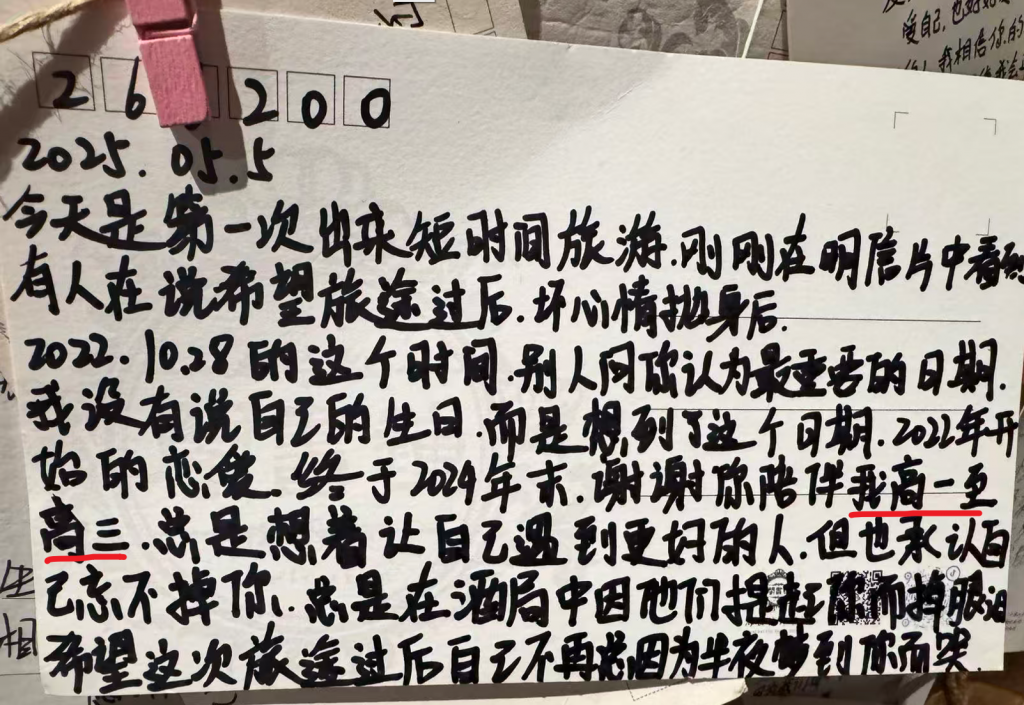 大部分都是年轻人写的,女性居多,透过字面,能感受到她们出来旅游的新鲜、和恋人在一起的幸福、失恋后的痛苦以及面对复杂人际关系的无力。