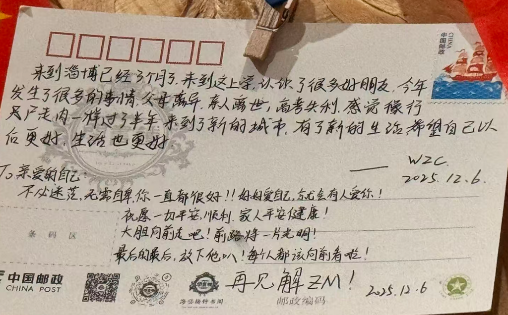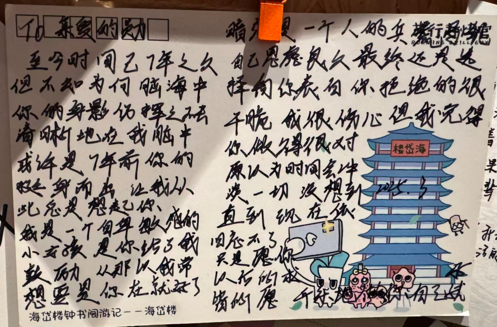 淄博有个网红景点海岱楼,自称是中国最美书店。在书店一个不显眼的角落,看到了贴在墙上的明信片,是游客们的小作文,他们把心里想说的话,留在了这面墙上。写下那些文字的时候,他们也许只是把它当作树洞,没有期望有人会去仔细阅读并感受他们的喜怒哀乐,而我恰好来到了这里,把整面墙的明信片一张一张津津有味的读完了。