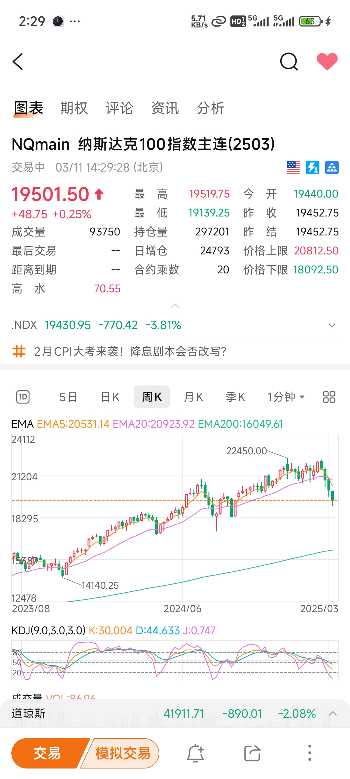 续请189.7万,期待非农4.1乐观一点,上半年就差不多了,这么不确定,对他也没好处,现在他手里有牌,非法移民,减税,都在进行中,这些牌打完了之后,就不敢这么作了。总体来说,现在也是要回调的时候。而且幅度可能比较大。一般来说,当纳指的点位接近周线的的200周均线的150趴的时候,可能一般145趴,美股都有一波较大幅度的回调。其实七月那次就是,可是可能回调幅度还不够。一般都要跌回到200周均线的地方。当然最好的走势就是慢慢下跌,等待均线上升后,这样幅度比较小。耐心一点,当然华尔街最喜欢的是像疫情一样的跌法。来钱快。