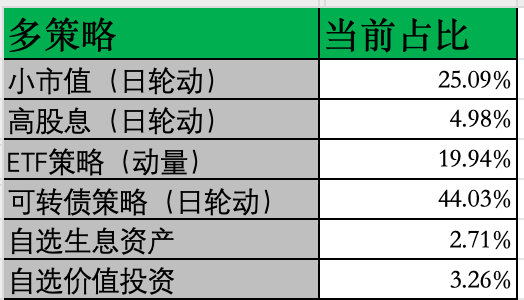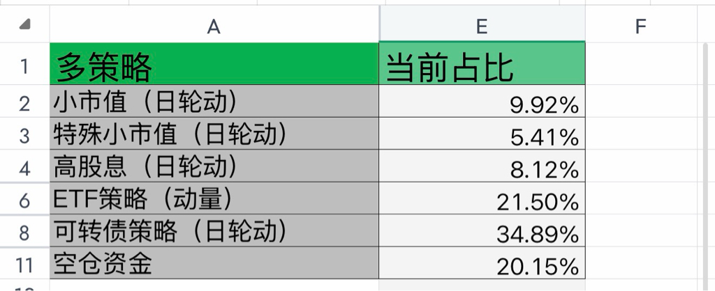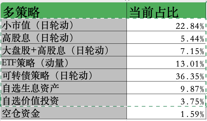 主要仓位还是在下面的这些策略类别。 其实从后面的详情分析可以看到,今天主要的收益都来源于小市值和可转债策略,后面的很多策略很没有提供正向的收益,或者刚跑不久没有收益。 不过未来可不一定,所以我就是要多品种多策略地执行,不排除未来在高股息、价投、ETF、期货、期权也有牛逼的一天。