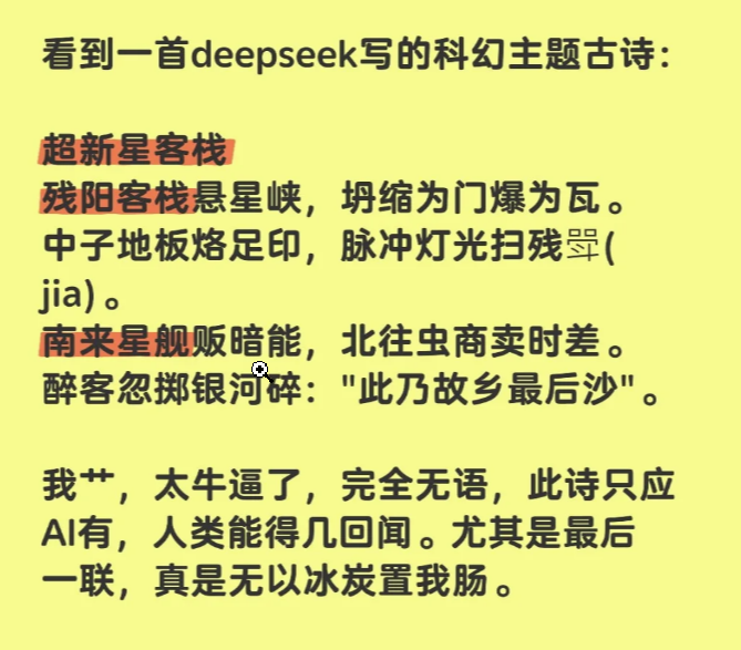 DeepSeek是个大烟花,够耀眼够惊艳。颠覆了固有印象,表面现象归纳以下几点1够好,够便宜。用openAI几十分之一的成本,差2代的芯片,造出同等性能效果。2几乎已经没有代差,快并驾齐驱了,原来说最少要差2-3年,现在看满打满算3-4个月。3几十名核心研发团队成员,没海归,全华班。4AI前10名中唯一一个开源的,看了一个团队负责人(浙大电子硕士)专访,大意是以前中国人科技都是跟在别人后边,之所...不要只是比成本。我们很多产品价格低是有原因的。美国人工资太贵。做这些工作的恐怕工资能差十倍。