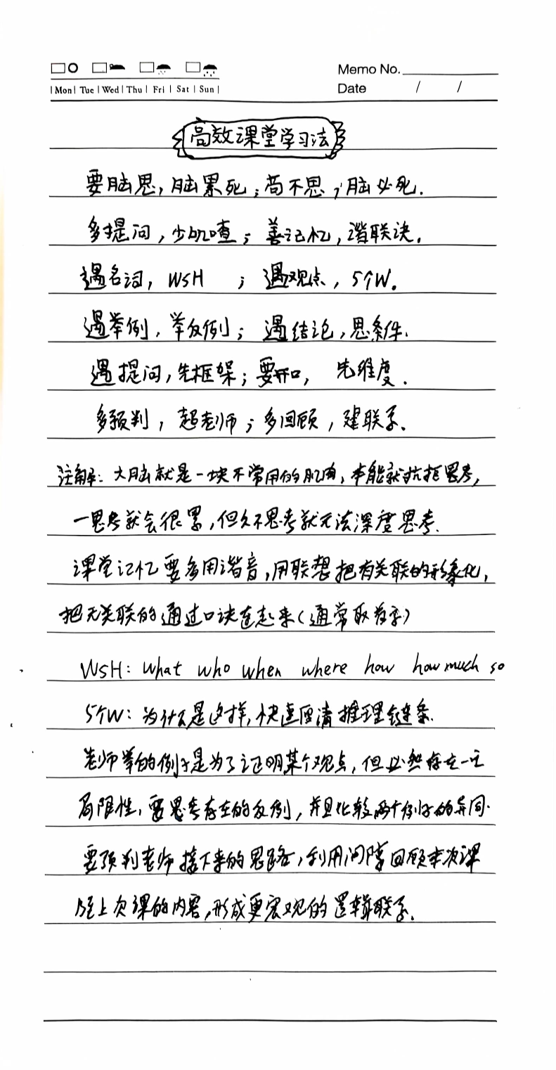 怎么听课怎么思考,读书是个验证预判的过程,读书和听课前要先猜测这节课的内容,假如自己是老师或者作者,我应该怎么办,然后带着猜想对比答案。
