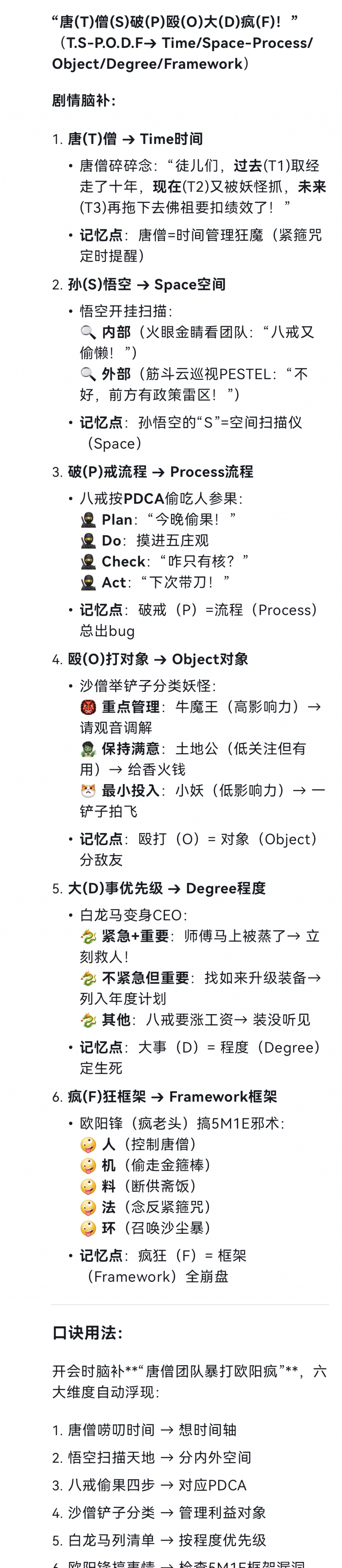 框架(人机料环法、SWOT工具BYD)来一套「西游战略打怪版」口诀,把首字母谐音梗升级成魔性剧情,包你过目不忘: