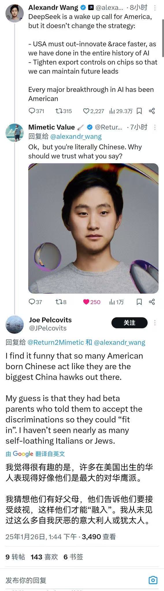 美国适合特别富或者特别穷的人过去,这两类人过去生活质量都有很大提高,中产或者小资过去可能因为没有适合的工作而导致生活水平大幅下降以前特别富的适合去美国,现在不是了。看看硅谷精英亚历山大-王,王是非常优秀的硅谷创业者,还是在美国本土出生,但依然被白人认为是chinese,不值得被信任。这还是在X上公开说的。美国在懂王MAGA们的领导下,重现1882年排华法案的日子可能不远了~