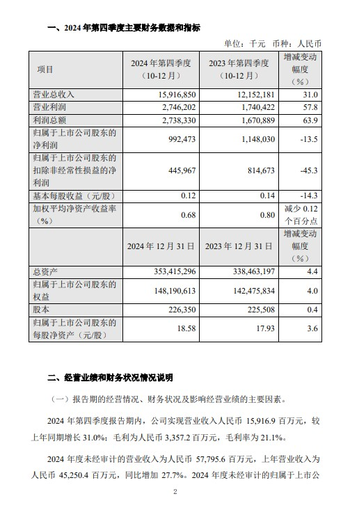 2月11日,中芯国际(688981)发布2024年第四季度业绩快报。第四季度实现营业收入159亿元,较上年同期增长31.0%;毛利为33.6亿元,毛利率为21.1%。归属于上市公司股东的净利润为9.92亿元,下跌了13.5%。