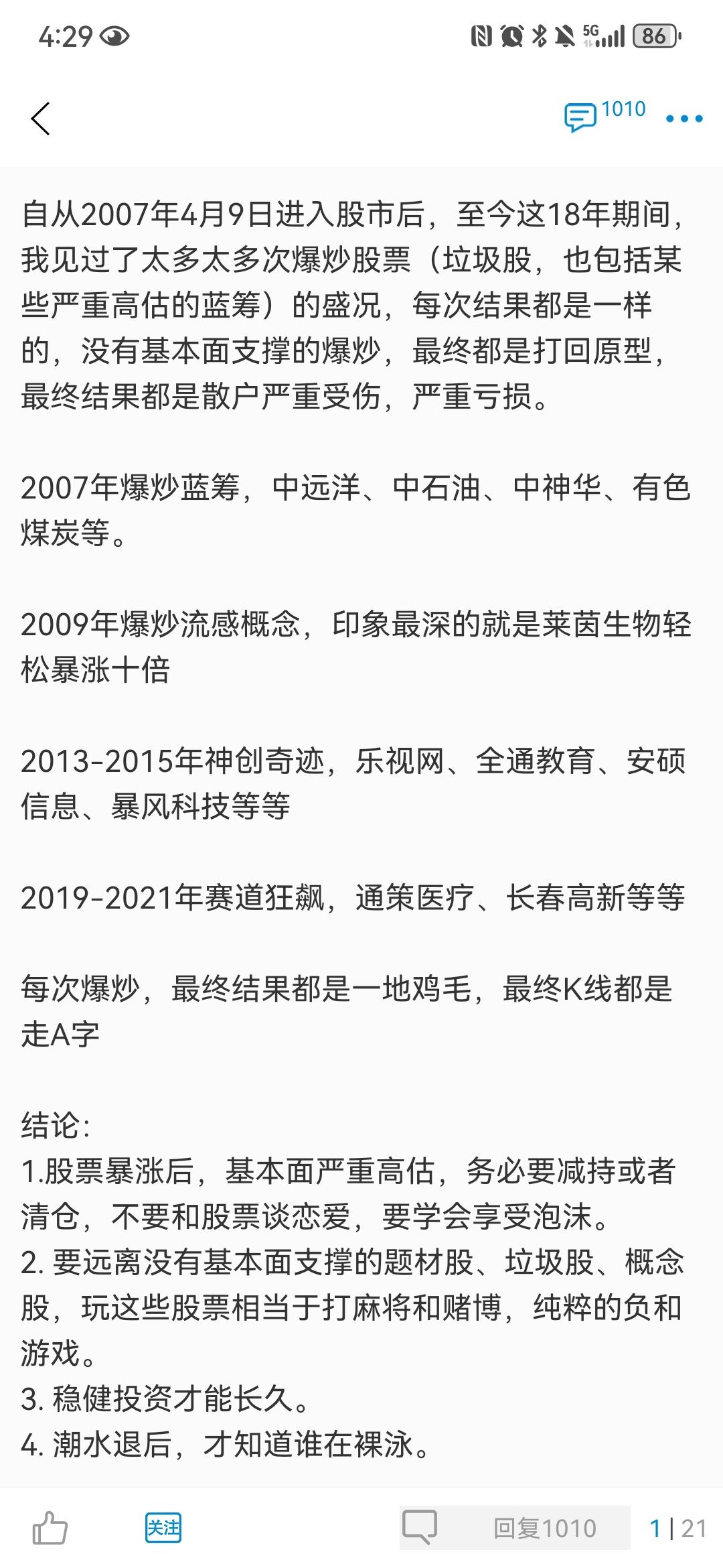 5. 加仓:加仓不要太急,单个品种仓位达到一定量就必须停止加仓,买入其它低估品种,其它品种得手了一样是赚钱。