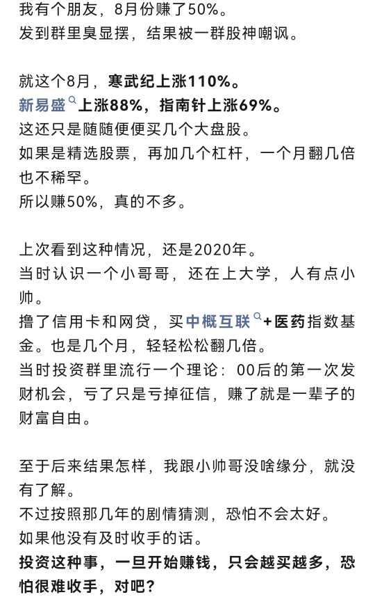 比如,很多人一看到科技股大涨,就担心踏空,忍不住跟风乱买。这其实是眼界不够宽的表现。黄金涨了那么多,你怎么不担心错过?商品期货每年都有一两波大行情,你怎么不着急?美股连续上涨这么多年,你怎么不怕踏空?正是因为眼里只有A股,才会把每一次行情看得过分珍贵,生怕错过一次就要再等好多年。