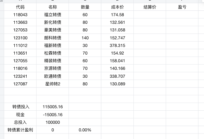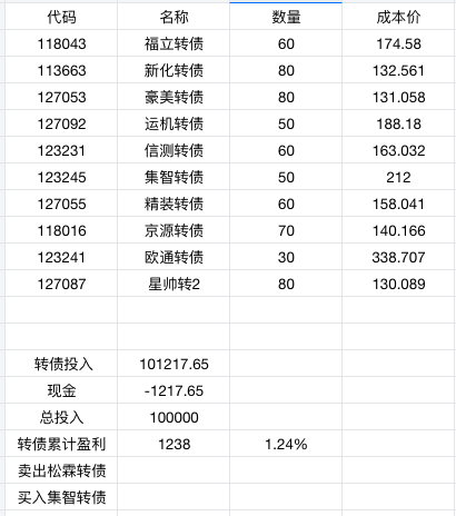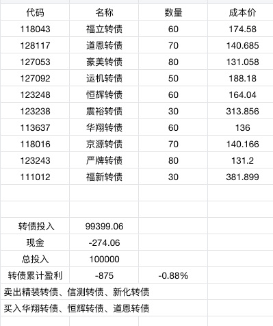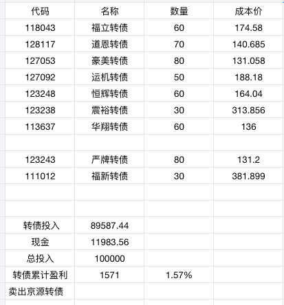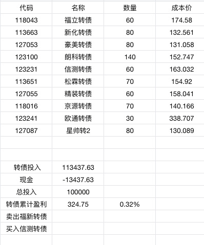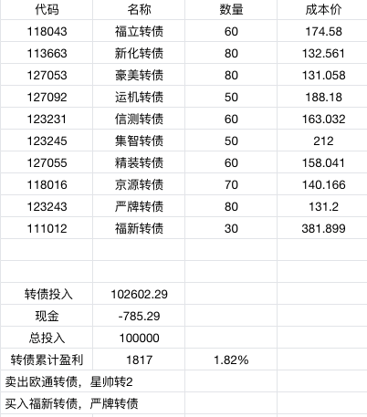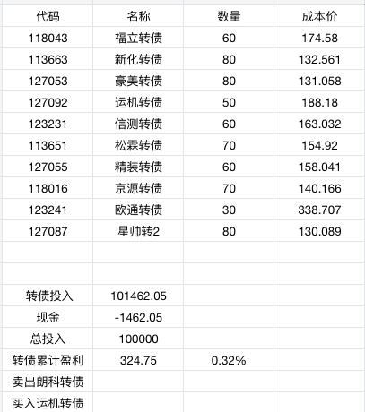 反思:今日亏损来自港股宽跨,饼子今天有调仓,但朗科是我之前买的,如果按饼子开始的时间算是赚钱的,按成本算是亏钱的,就按不亏不赚算了。也没卖,转股套溢价去了。