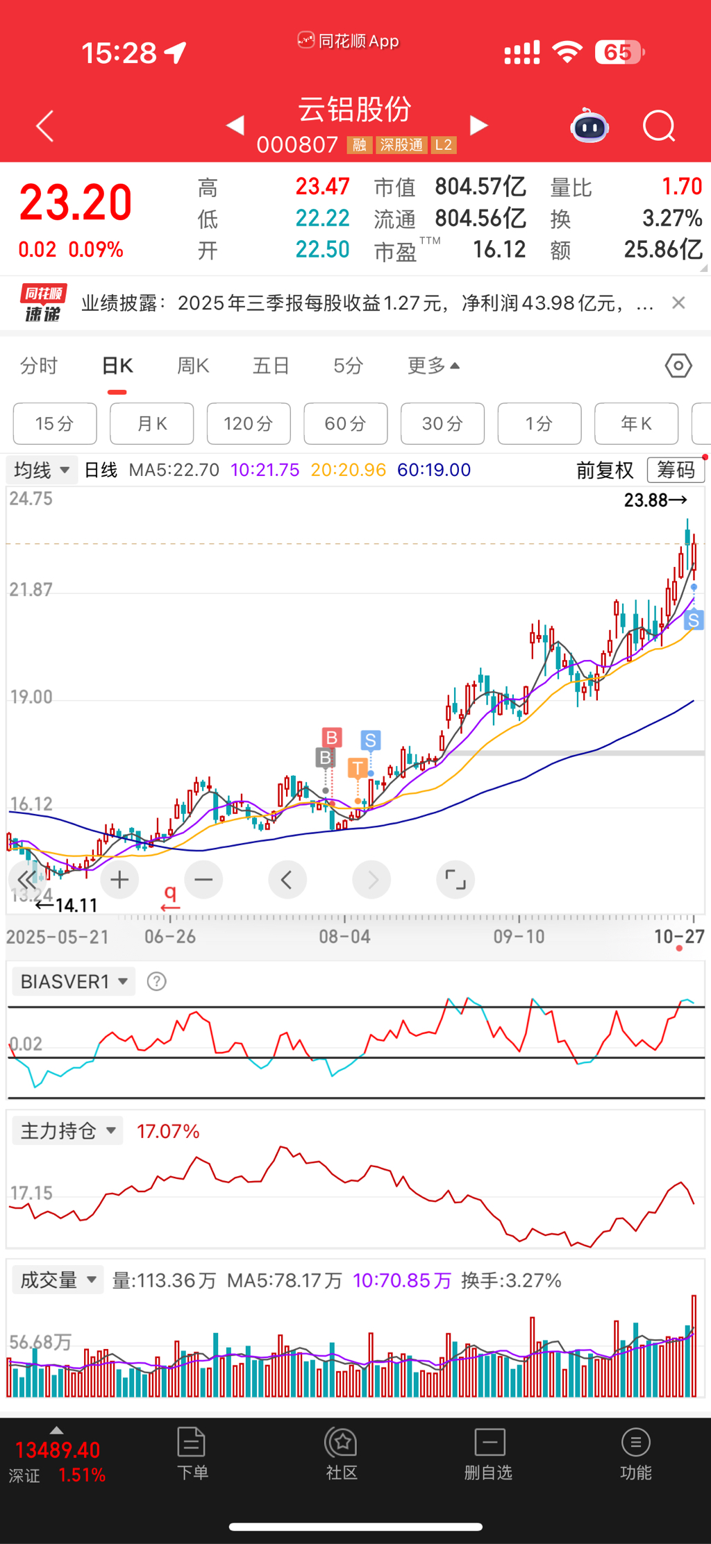 盘中神火换到云铝,神火最近跟煤炭,也跟电解铝,所以说不好今天是不是好操作。二者走势类似,就当练练切换吧,赚多赚少也是同个板块,大差不差了。神火单就四季度应该是比云铝有优势的,但是云铝三季报可能藏利润了,算是小赌一下。