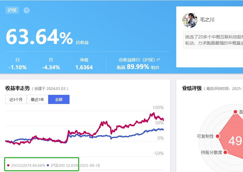 很羡慕毛大师1年67.4%的超额收益。