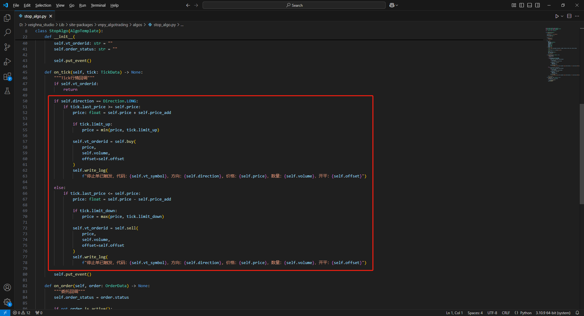 代码可以看这里,主要是tick行情回调。一般行情推送过来(一秒两次),就会执行这里的代码。所以你写这边的代码即可。