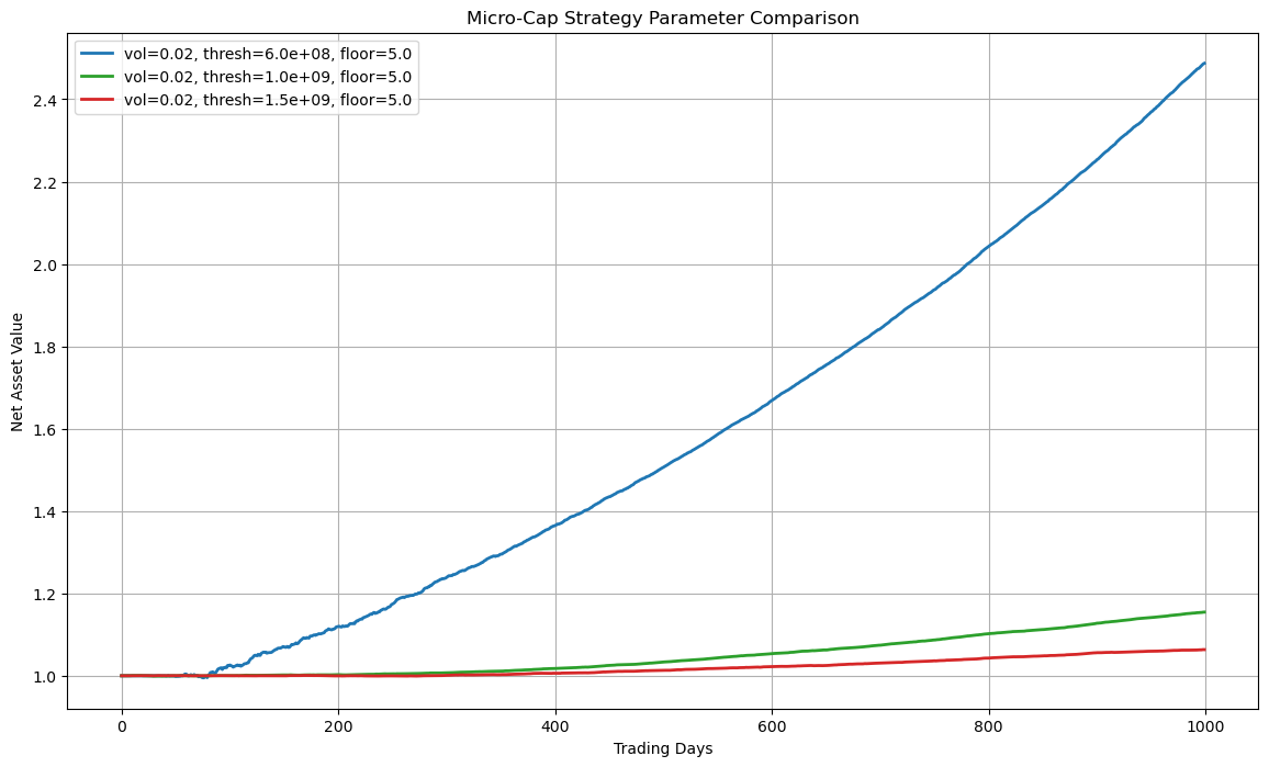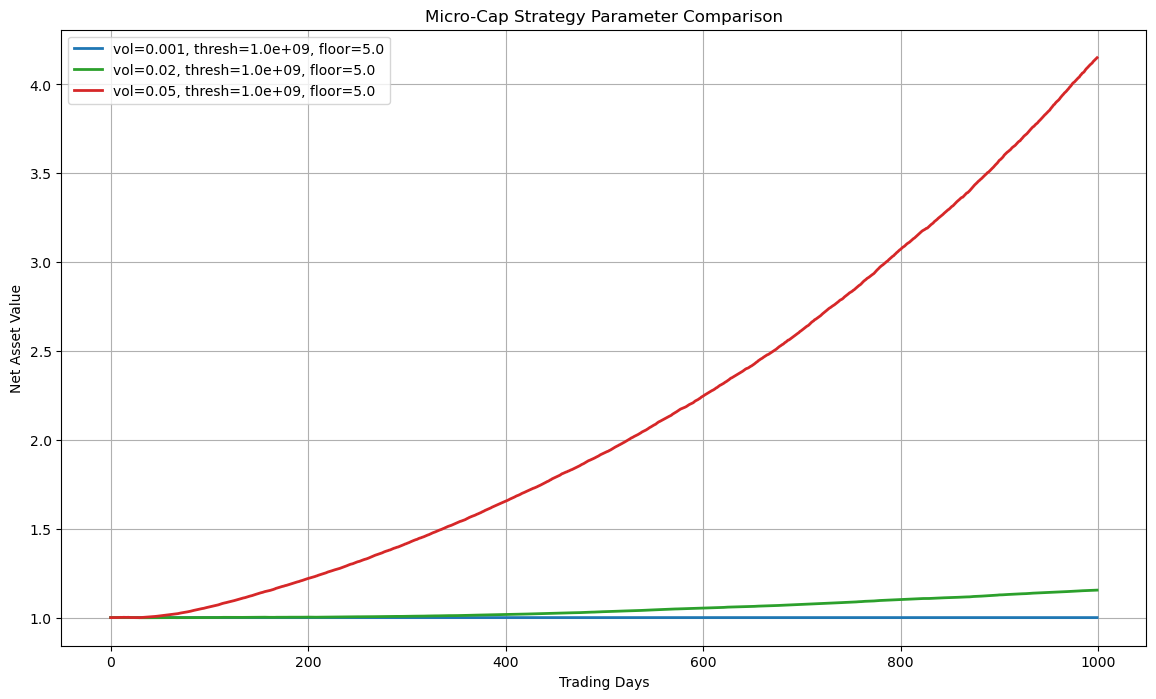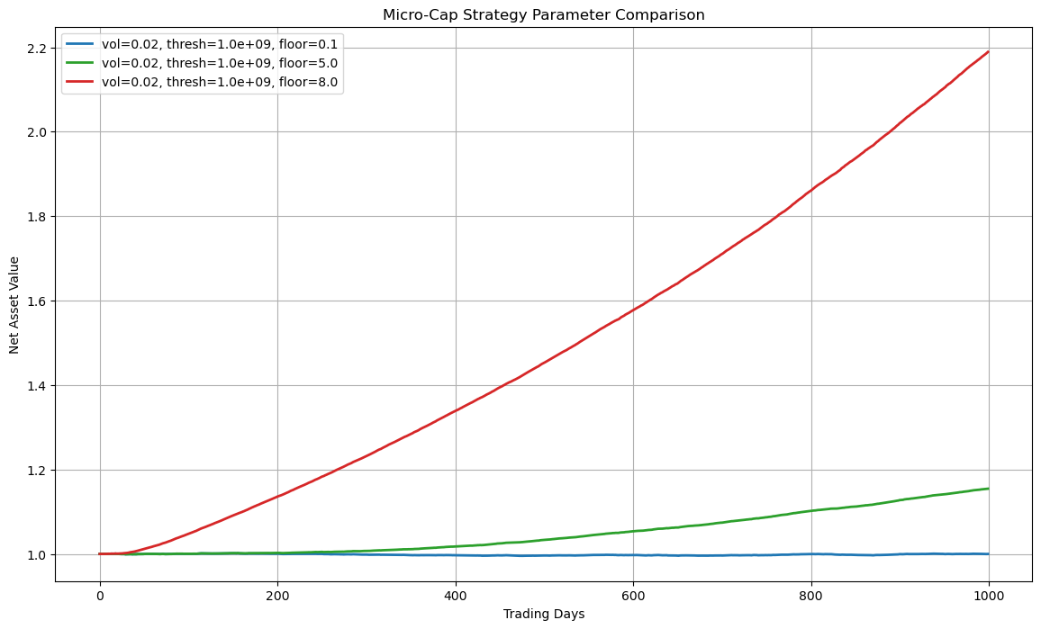 模拟的设置是设置1000支股票,初始股价都为10元,股本都为1亿股,股价每天会随机波动,通过设置日波动率股价下界(股价不会低于这个价格),微盘股阈值 模拟上述微盘股策略(每周调仓,共1000个交易日)来看看能否单纯依靠波动赚钱。