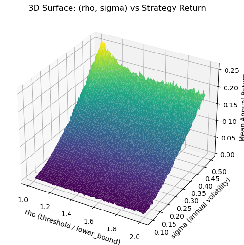 正文也说到这个机制套利的收益率应该是(价格阈值、价格下界、波动率)的函数,特别是价格阈值和价格下界又可以简化成一个比值,从而收益率可以简化为二元函数,尝试在理想情况下从数学上推导,但数学功底不太行,只能退而求其次用蒙特卡洛模拟画了一下