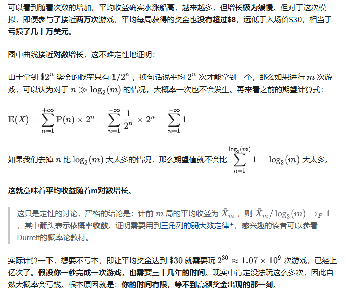 此处有谬误,这里期望是单次游戏的期望收益,所以只需要减去一个30,正无穷-30依然是正无穷。可以参考:https://zh.wikipedia.org/wiki/%E5%9C%A3%E5%BD%BC%E5%BE%97%E5%A0%A1%E6%82%96%E8%AE%BA不是一个,是减去n个30。