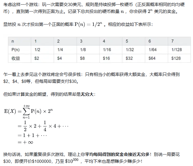 此处有谬误,这里期望是单次游戏的期望收益,所以只需要减去一个30,正无穷-30依然是正无穷。可以参考:https://zh.wikipedia.org/wiki/%E5%9C%A3%E5%BD%BC%E5%BE%97%E5%A0%A1%E6%82%96%E8%AE%BA这个30要在每一种情况里减去