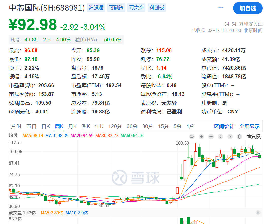 A股19.88亿股,最新市值1849亿元。港股59.9亿股,最新市值2785亿元,合计4634亿元,640亿美元。全村的希望,离行业老大台积电9000亿美元的市值不可同年而语。总股本79.81亿股