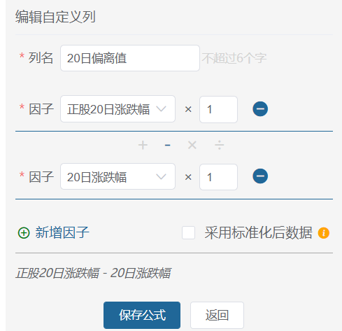 自定义列目前只能新增一列,可以使用最多7个因子参与计算(加减乘除)