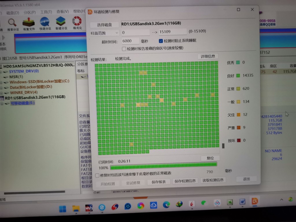 这是我检测的刚买的闪迪128G的一个U盘坏道检测报告,没有检测到坏道,但有极个别不良好道区,如果对读写资料没影响也能接受,毕竟价格摆在那里,在拼多多官方旗舰店才39.9元一个