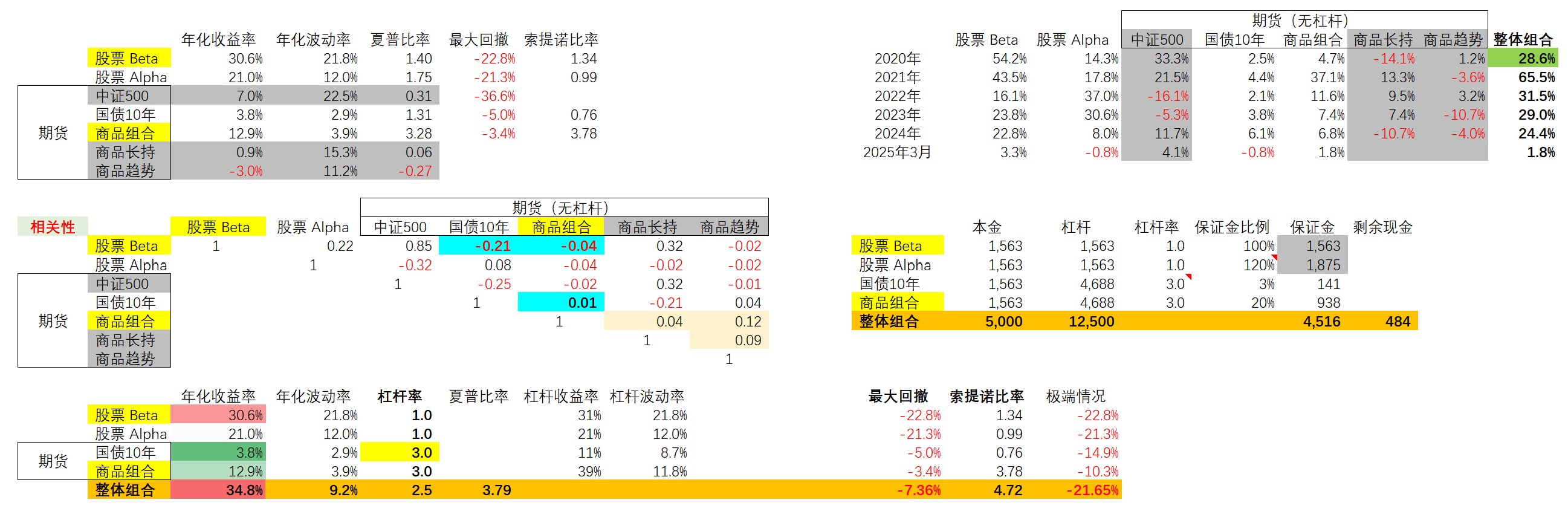 上述5个多资产策略的相关性很低,组合配置可以实现稳健的投资收益(2019 - 2025.03):