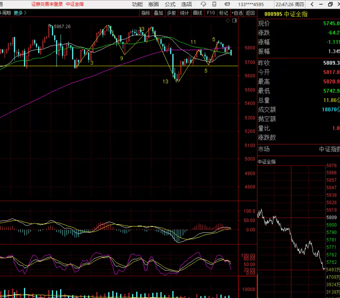 为什么我会以中证全指为操作依据,主要是中证全指反馈是所有上市股票信息,上证 、深成、创业仅仅反馈的是一部分,当中证有赚钱效应时,市场大多个股是有赚钱效应的,而其他三大指数只有在特定环境下才能反馈赚钱效益,譬如当下只有上证指数创新高,打开上涨空间,其他两指数还在震荡模型没。