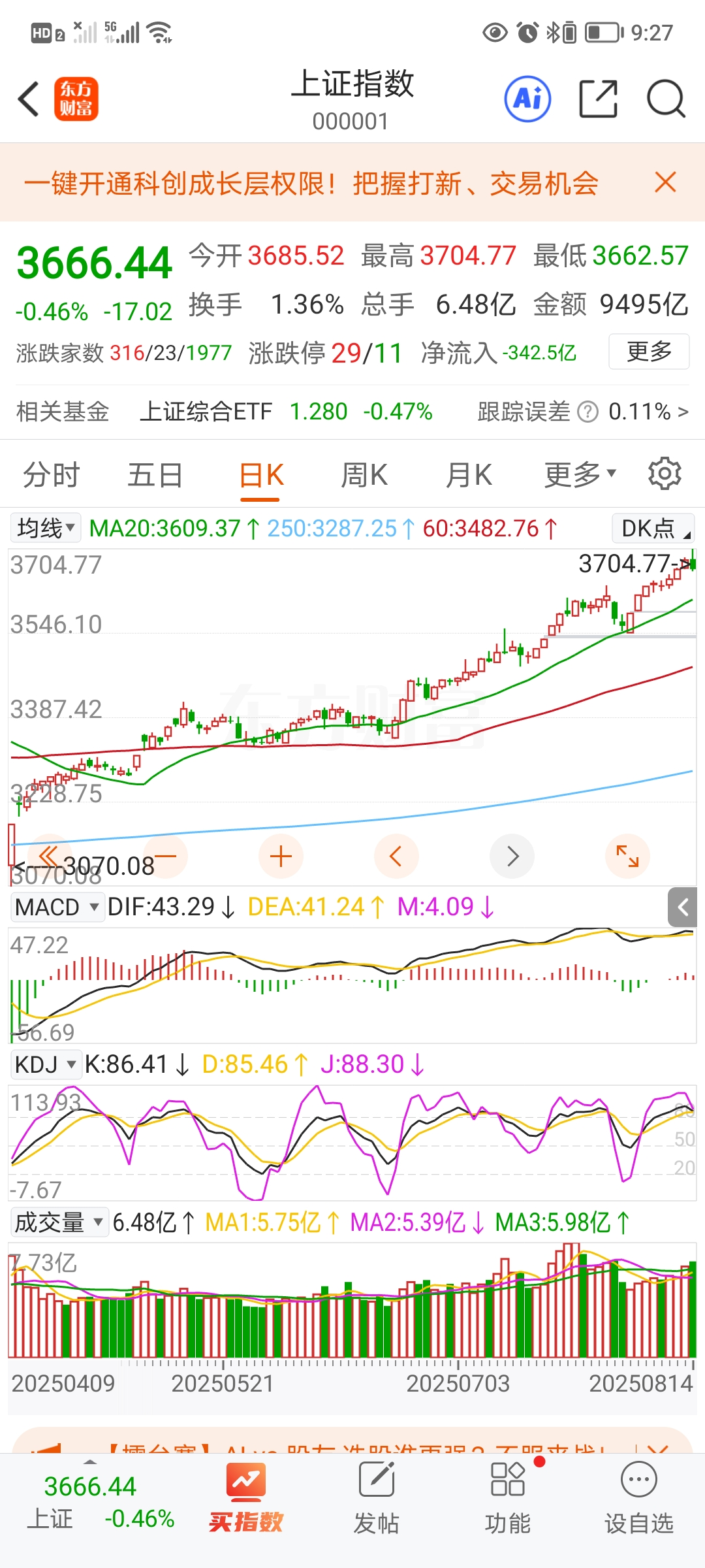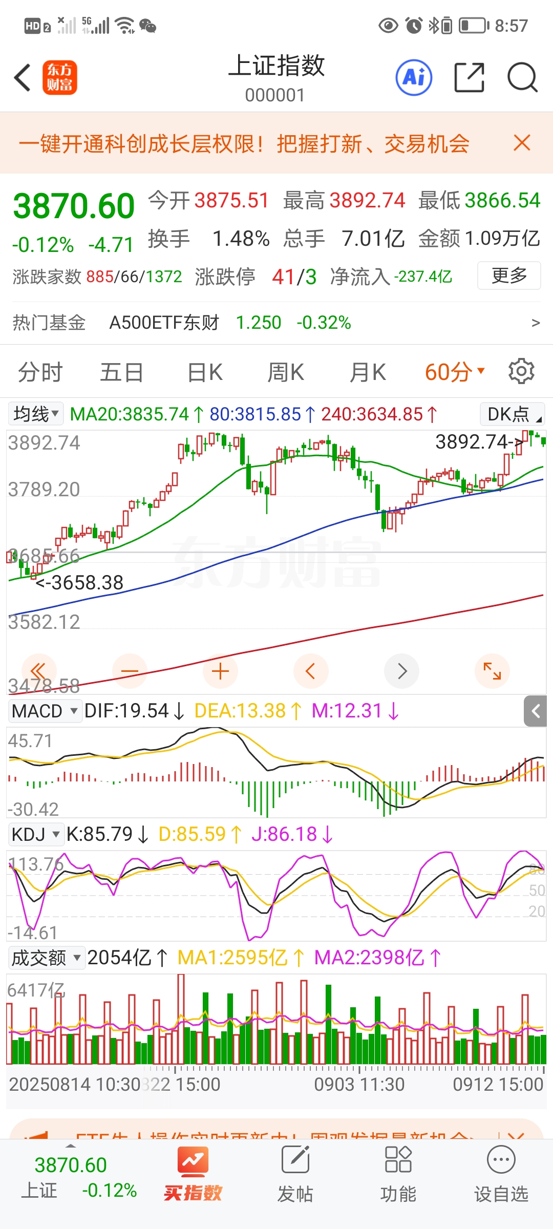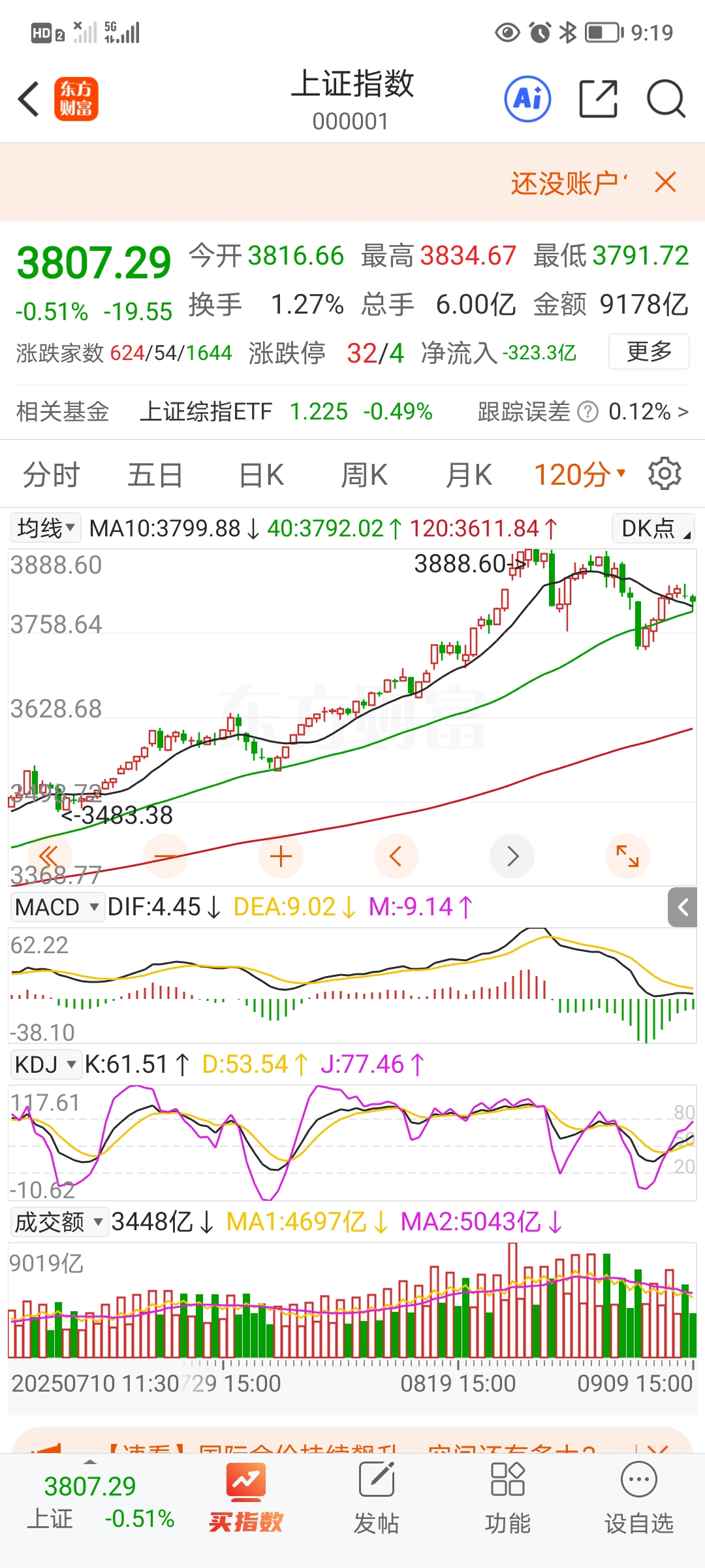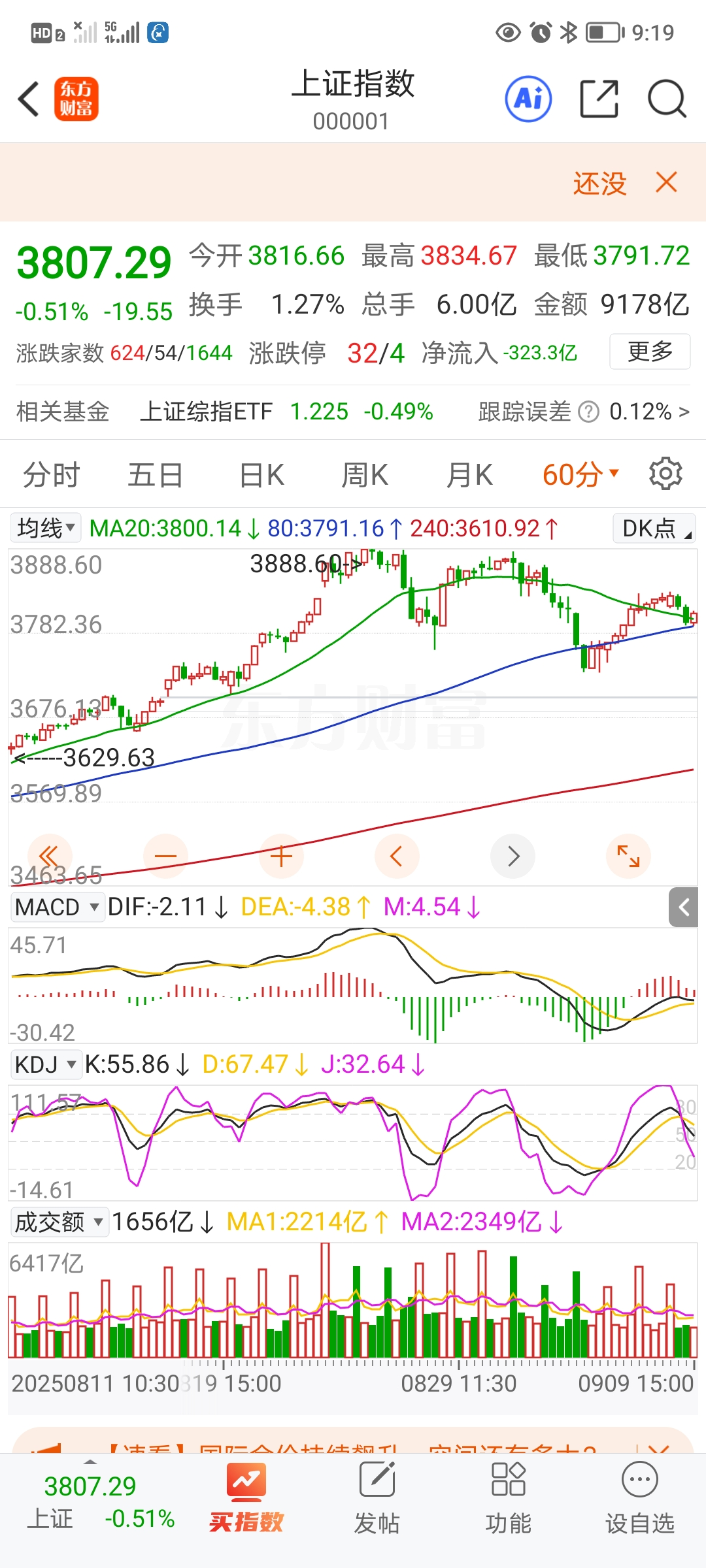 从日K线分析,MACD这种走势如果DIT不能迅速上穿DEA,指标将向零轴迅速靠近,此阶段是结构回调往往是股价迅速下杀最厉害的一段,也是最磨人阶段。但从K线结构来看,当MACD死叉后并未迅速大角度下调,整体结构走向横盘或小角度回调。今天看到指数创新高,这是一个好的亮点,进一步说明市场还是挺强,只是涨的多了,需要阶段性调整调整。