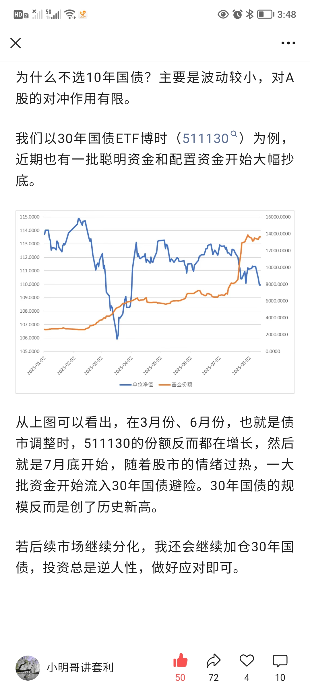 - 小明哥明确提到选择30年国债而非10年国债,因其波动更大,对A股的对冲效果更强。例如,2025年7月底股市过热(中证2000市盈率148倍),资金涌入30年国债ETF(511130)避险,推高其规模和价格。