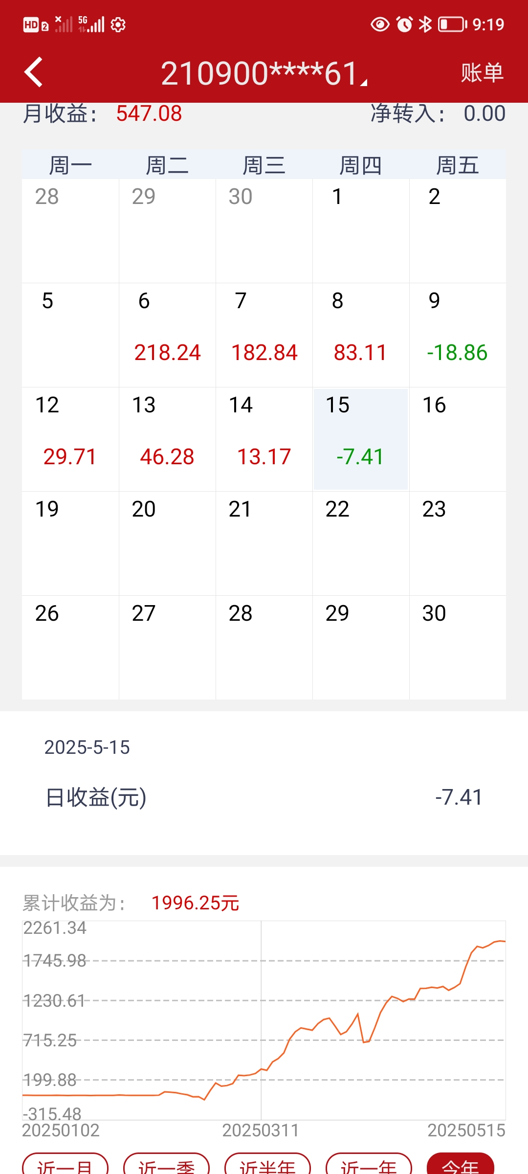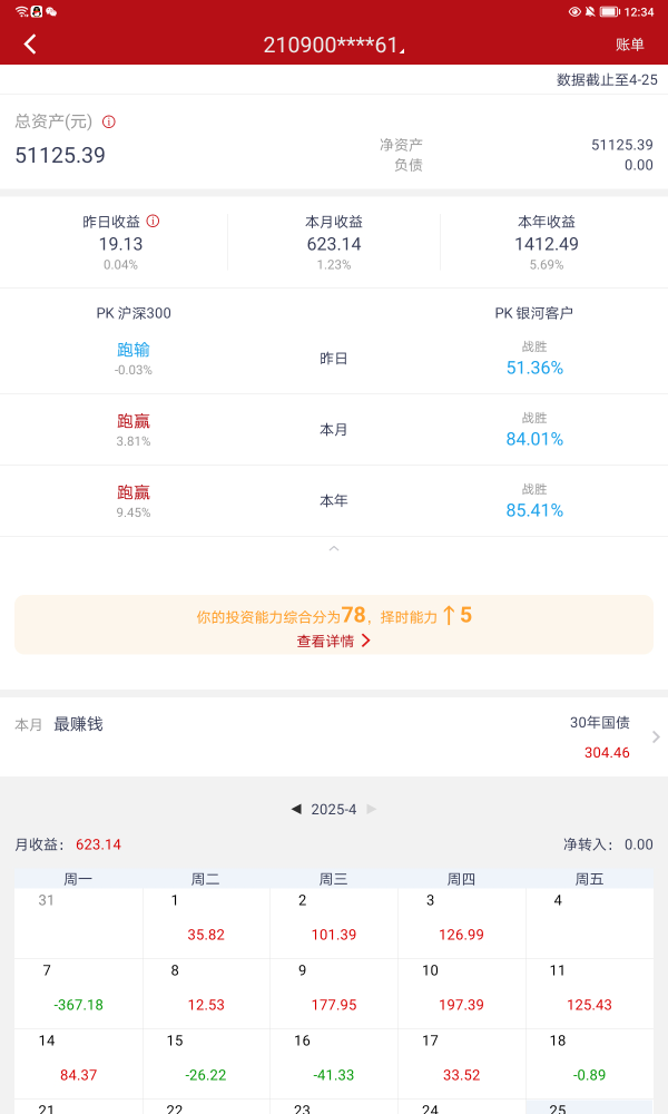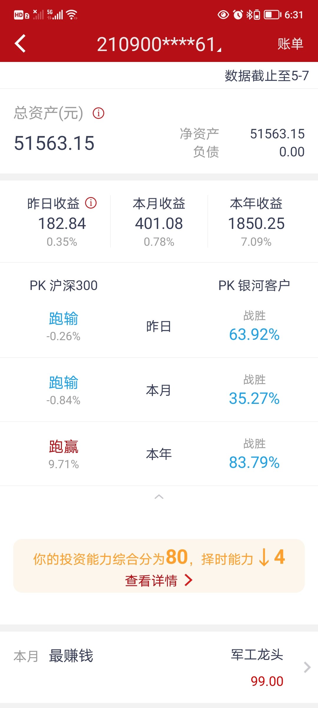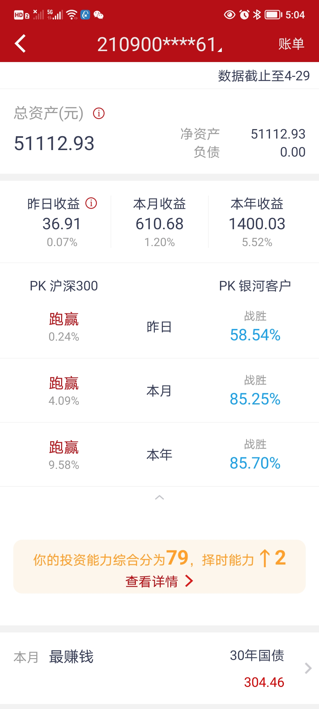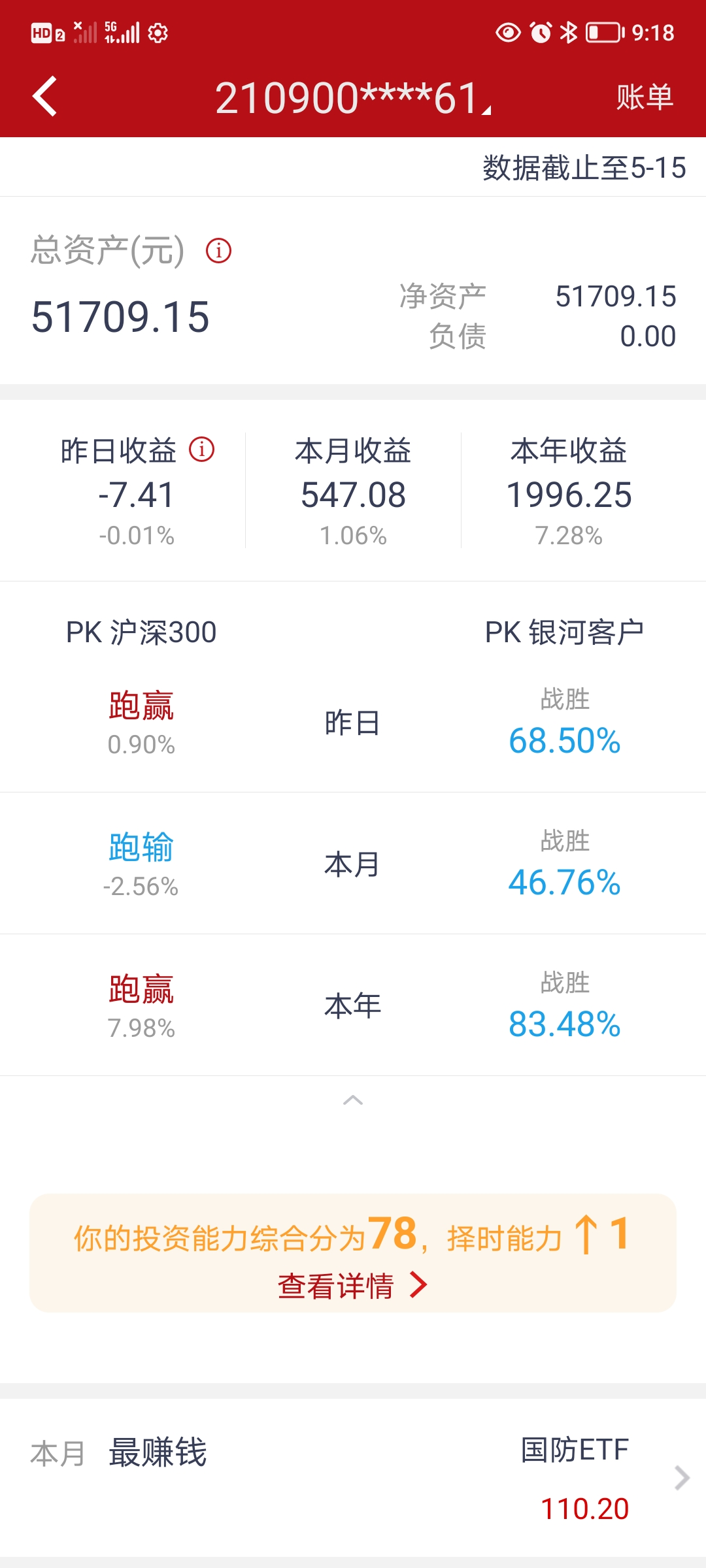 过完清明,看到外围的市场大跌,顿感周一情况不是很妙,其实在上周四时大盘所有预感,在上周四时资水老师及寂寞青山老师已经在公众号已经对大盘的疲软有所提式,预示大盘调整来临,自己的操作体验也感受到了大盘的滞涨,马上转入大盘的回调,只是没想到经历清明三天时间外围市场的反应比我想想的还要大,还要猛。好的是,在周四清明放假前清盘了30年国债ETF和etf,仅留了点华夏蓝筹LOF。为什么要清盘30年国债,主要是120价位买入时,自己第一判断价位是124-125,目标价已经达到,决定退出,哪知这周一债券还是继续上涨,冲到126,这真没法预测;那为什么没有清华夏蓝筹呢?这个真是自己的侥幸心作祟,其实华夏蓝筹早两周买入,上周时已经连续阴跌了两周,跌破买入时的止损价,自己想着就在止损价等等会涨起来的,可惜大环境不给力,这周一开盘来了一个惊吓,虽然买入不多,资金量小,但确实影响了整体回撤。总结下这周的操作:1.买入卖入原则要一直,该止损止损,盈利的单子可以让子弹再飞飞,等真真的确定信号出现了再卖;2.大盘的判断分析永远要放在第一位,择时、博弈在我的系统里要放在第一位;3.必要时学会空仓。