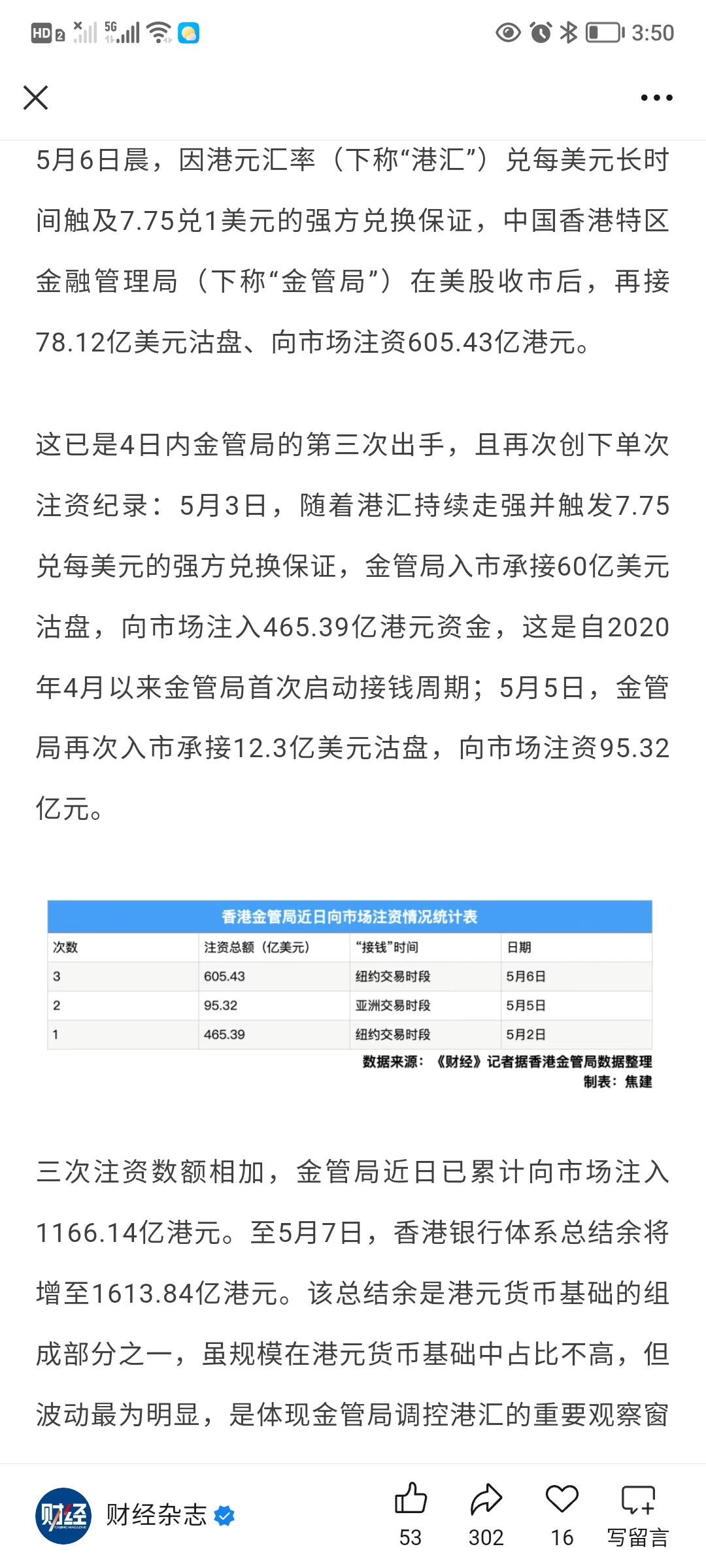 香港金管局披露,斥资465.39亿港元(约合60亿美元)购买美元,以捍卫港币联系汇率制度。这是香港金管局有记录以来最大的单日美元购买操作。此前,美元兑港币汇率于5月2日触及7.75的强方兑换保证水平。香港金管局发言人表示,近期港元偏强,主要由于股票投资相关的港元需求有所增加,支持港元汇价。