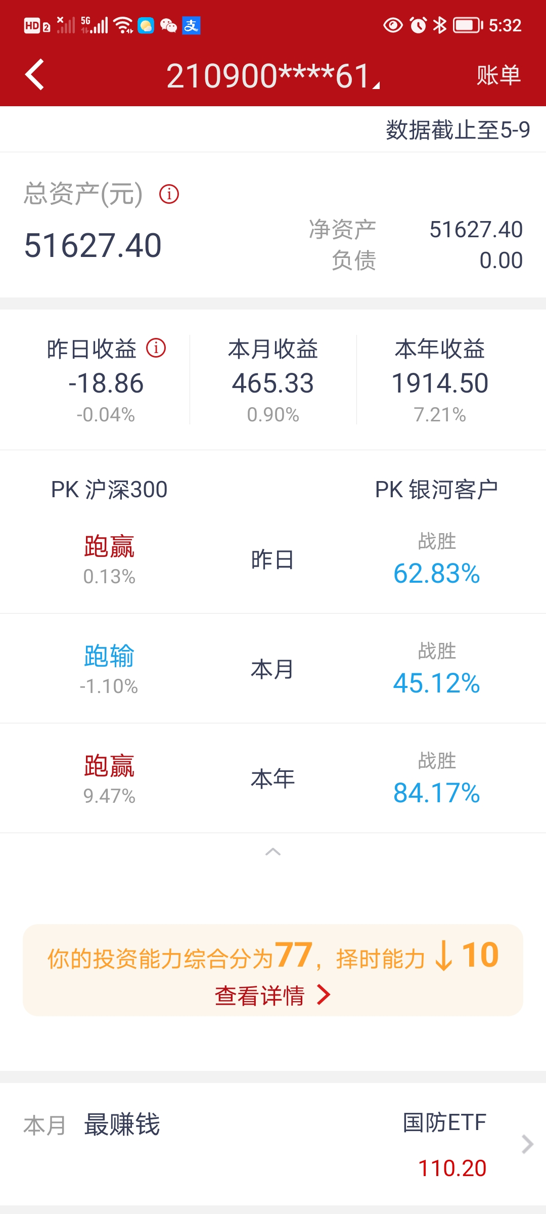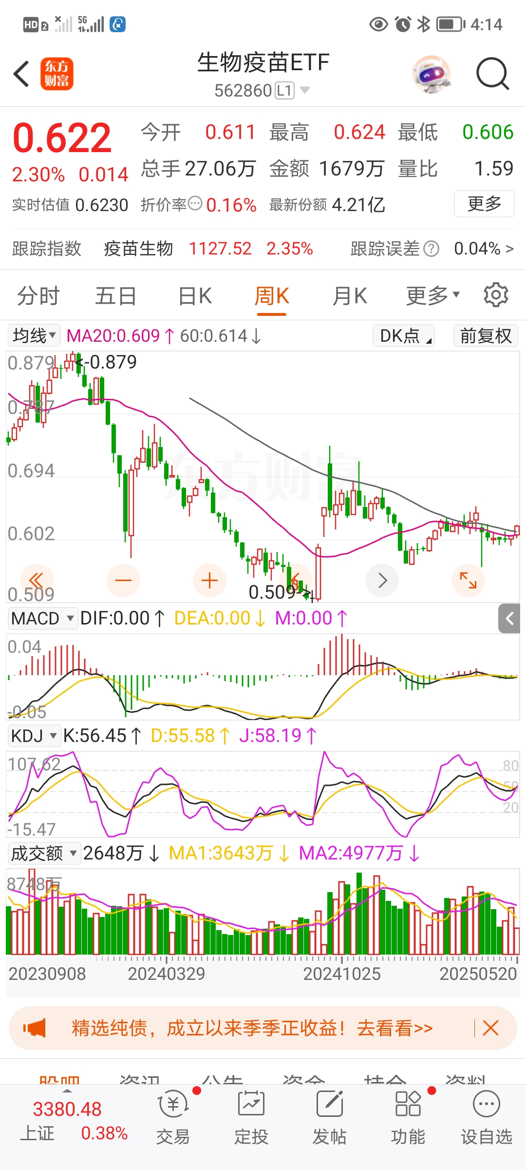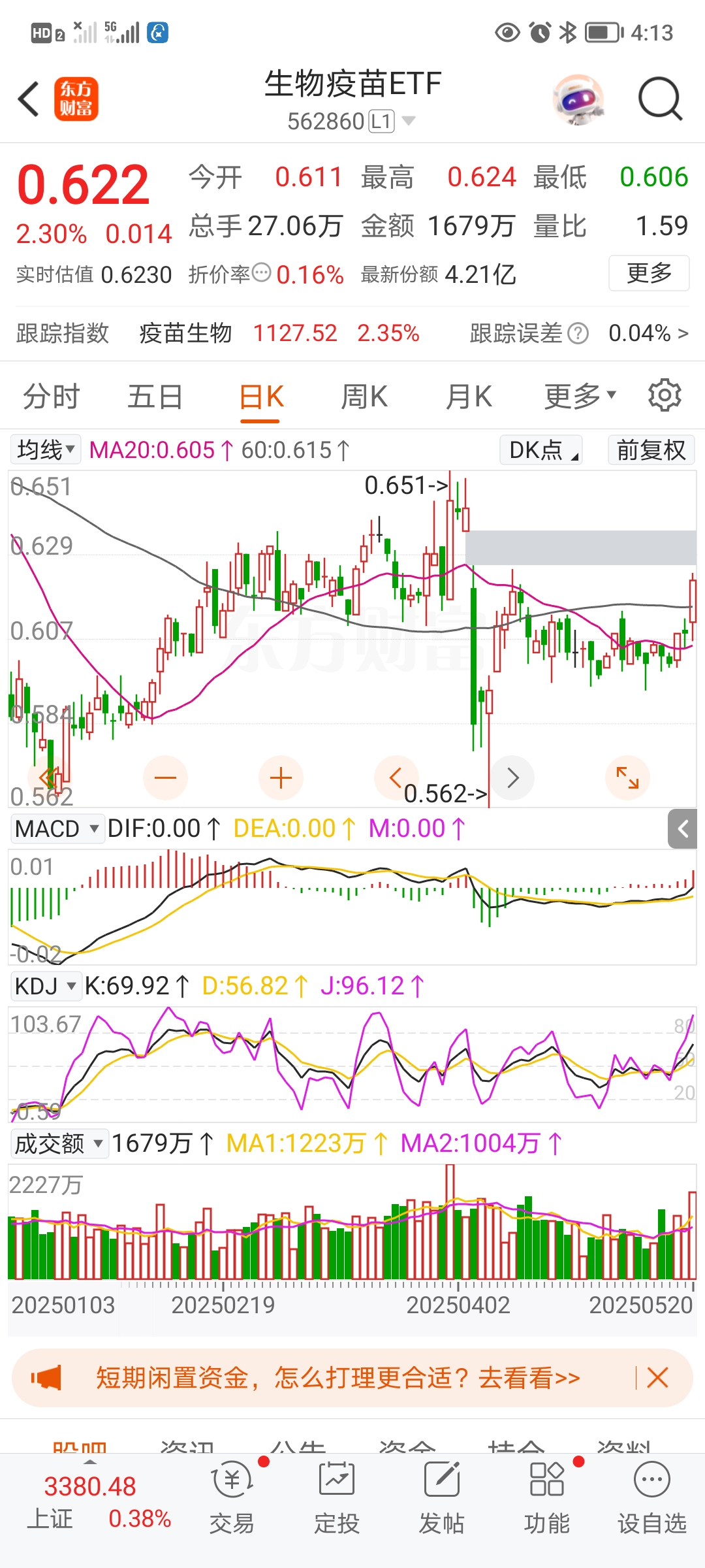 节前买入的高端装备ETF、国防ETF、军工龙头ETF、央企科技etf表现相当不错,尤其是高端装备和国防;例外持有的疫苗ETF、医疗ETF今天冲高后回调部分,途中将医疗减仓部分。