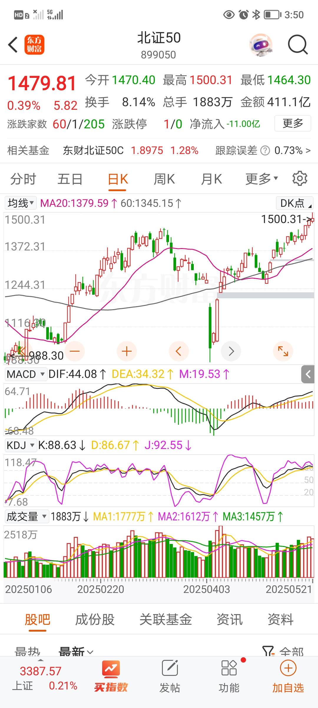5.21行情走的艰难,下跌数多于上涨数,盘面上每到一个高点后有瞬间猛烈下跌迹象,赚钱效应差。盘中北证50创出新高后,尾盘回调,整天形成一根倒T,深证、创业指数到了60日均线附近遇阻,整体回调概率增大,继续观望。
