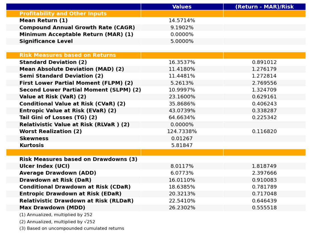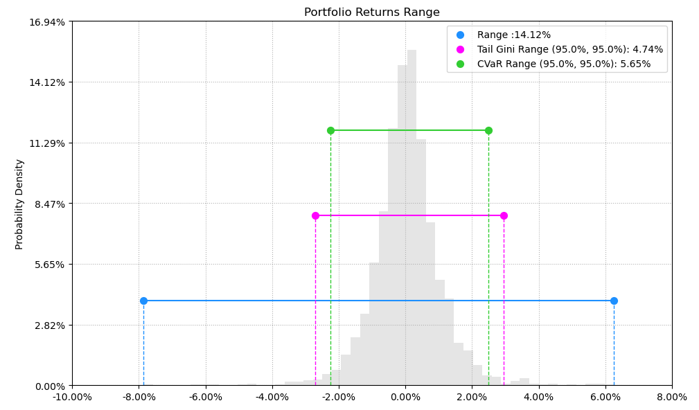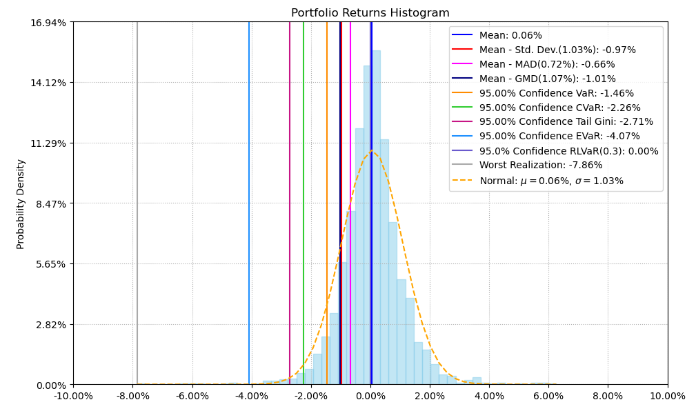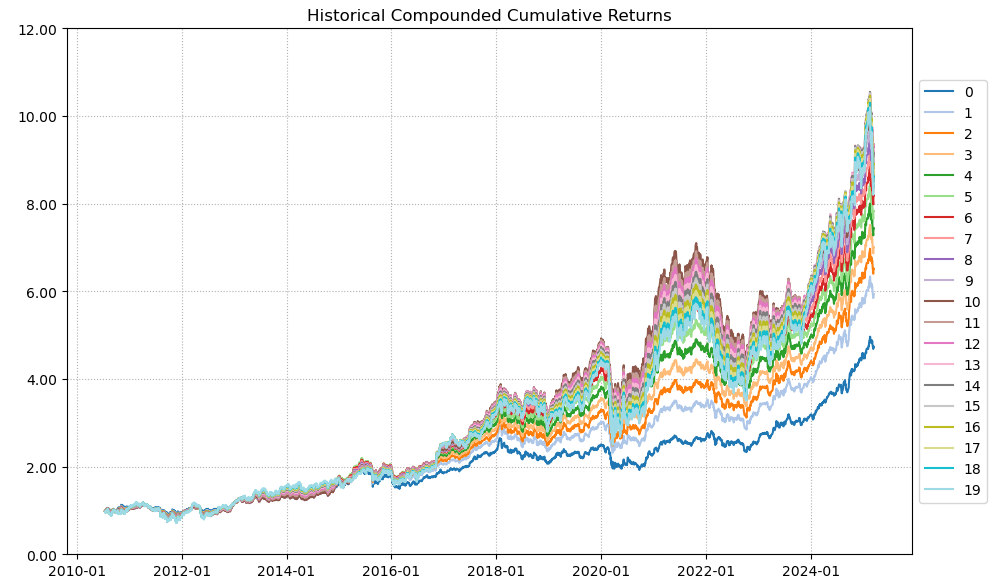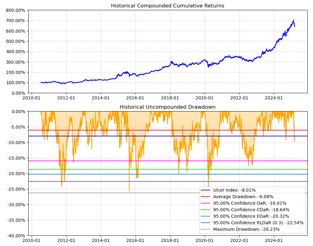 最后看下整个投资组合的情况,日度均值回报在0.06%,比上次测的电气设备行业低30%,5.65%的CVaR波动相应也会小很多。(注:均值回报看Mean那一栏,越高越好;CVaR波动看CVaR那一栏,越低越好)