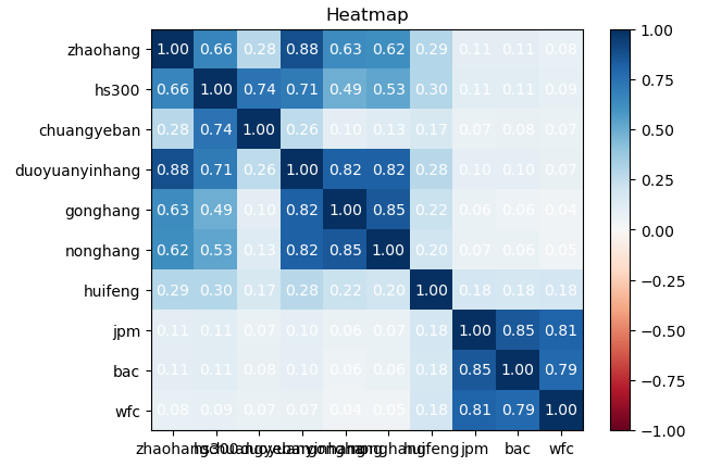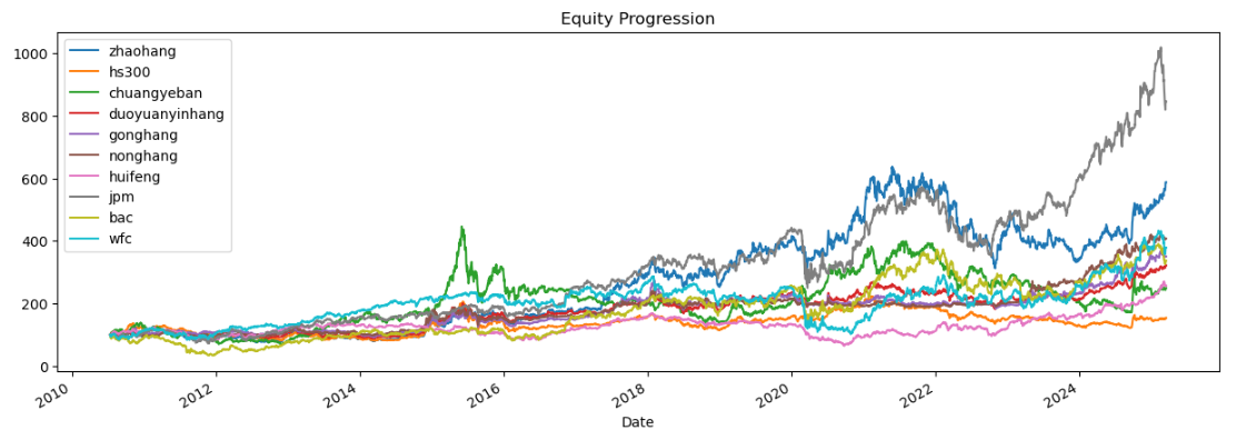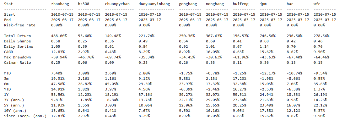 区间累计回报近8倍,最大回撤26.23%,投资组合的整体表现远好于招商银行个股。整个多元银行行业盈利能力一般,波动低位,夏普比率0.94略显平庸。(注:累计回报看Cumulative Returns那一栏,越高越好;最大回撤看Maximum Drawdown那一栏,越低越好)