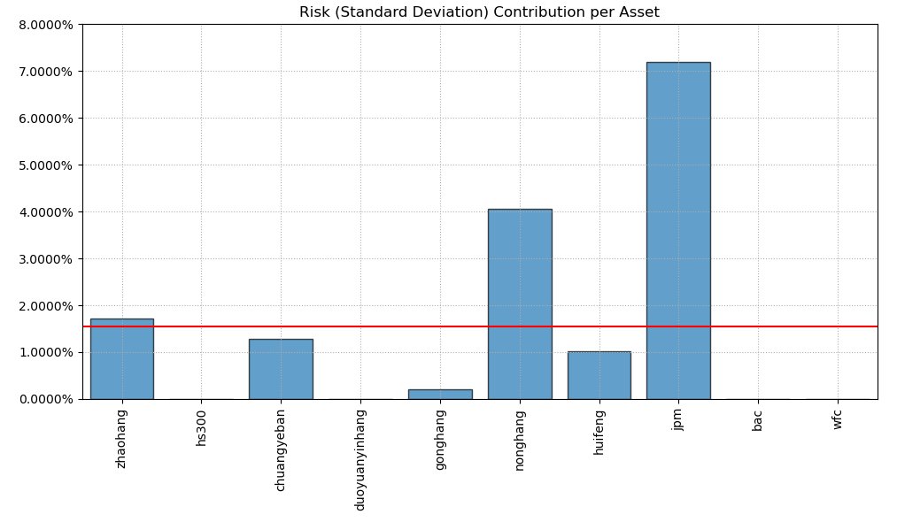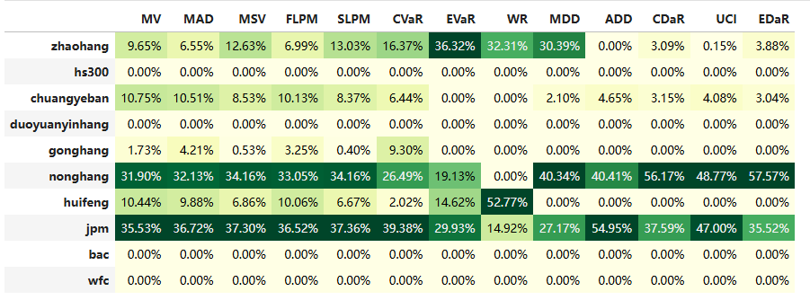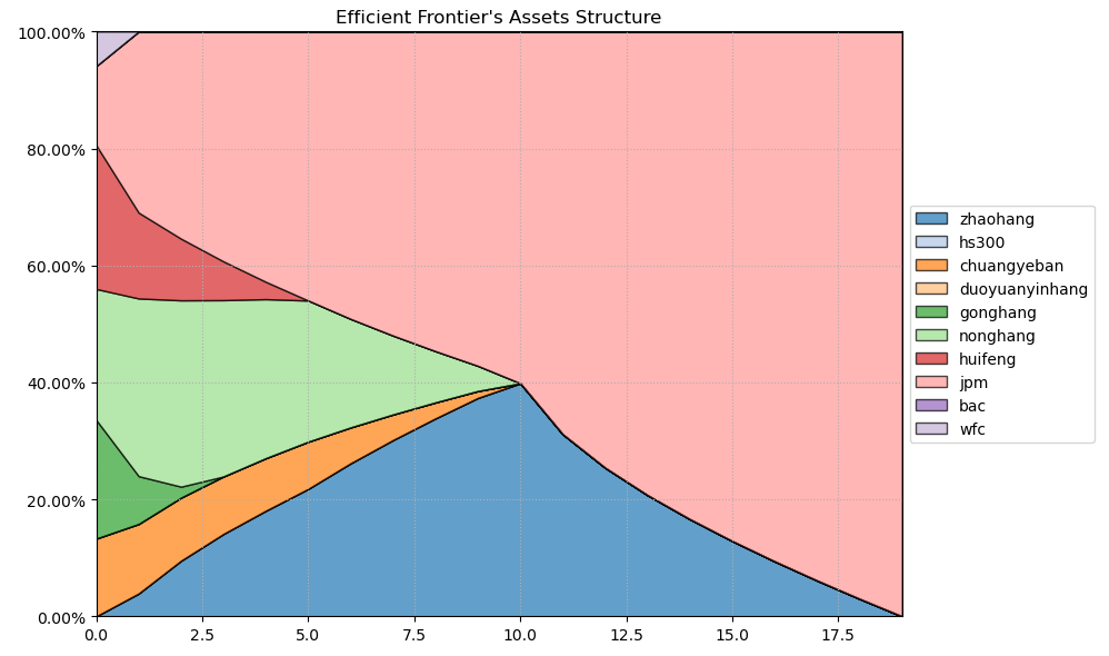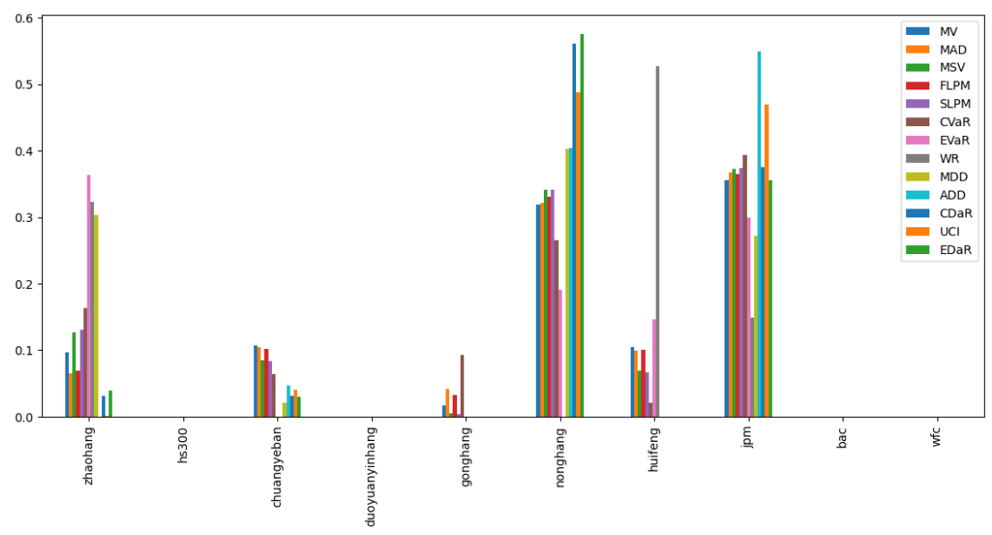 如果换成其他约束,系统给的配置比例也大同小异,基本是在农业银行和美股的摩根大通之间做取舍了。(注:占比越高越好)