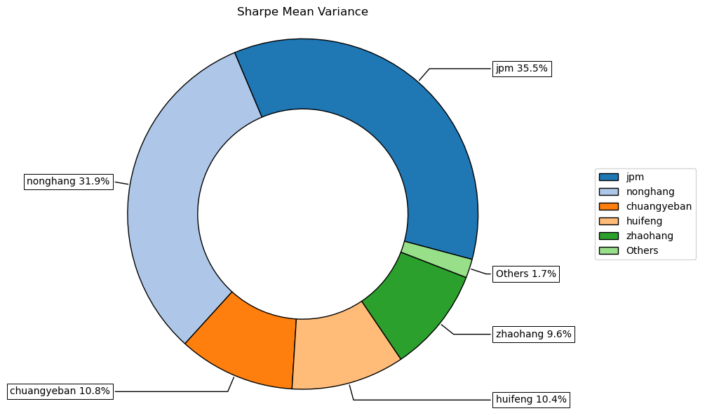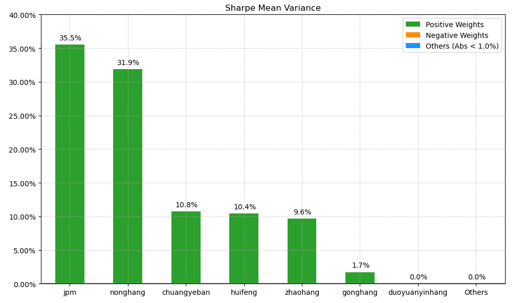 按最高夏普比率配置的话,系统给的权重为9.6%,最大权重给了美股的摩根大通占比35.5%。(注:占比越高越好)