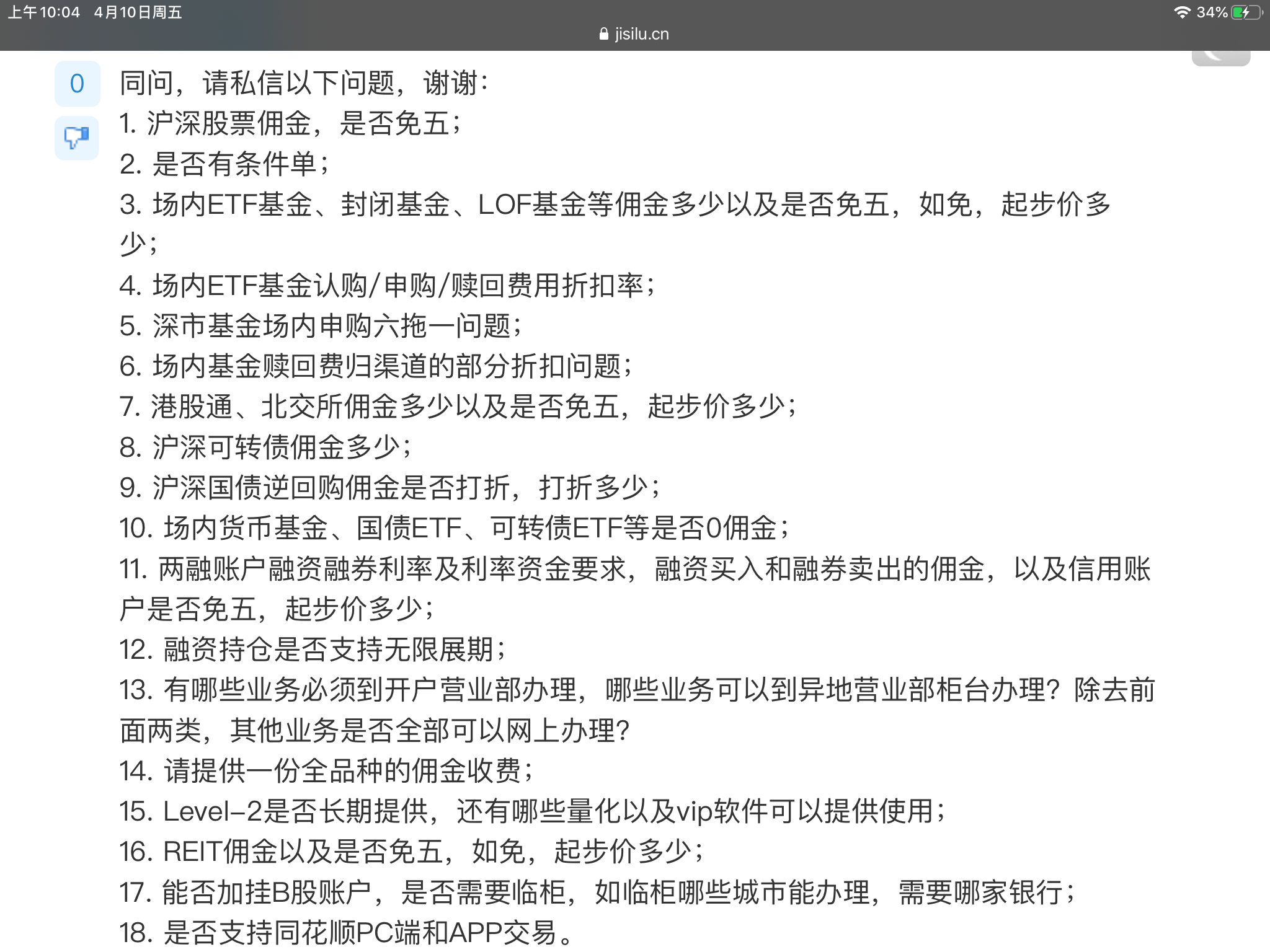 同问,请私信以下问题,谢谢:1. 沪深股票佣金,是否免五;2. 是否有条件单;3. 场内ETF基金、封闭基金、LOF基金等佣金多少以及是否免五,如免,起步价多少;4. 场内ETF基金认购/申购/赎回费用折扣率;5. 深市基金场内申购六拖一问题;6. 场内基金赎回费归渠道的部分折扣问题;7. 港股通、北交所佣金多少以及是否免五,起步价多少;8. 沪深可转债佣金多少;9. 沪深国债逆回购佣金是否打折...
