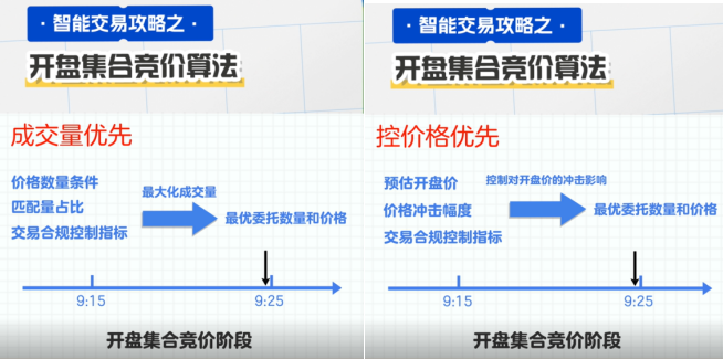 开盘集合竞价算法 :在接近开盘集合竞价结束的时刻,系统预估开盘价并综合考虑投资者设定的价格数量条件、报单风格和交易合规的各项控制指标,以适合的价格和数量进行委托。