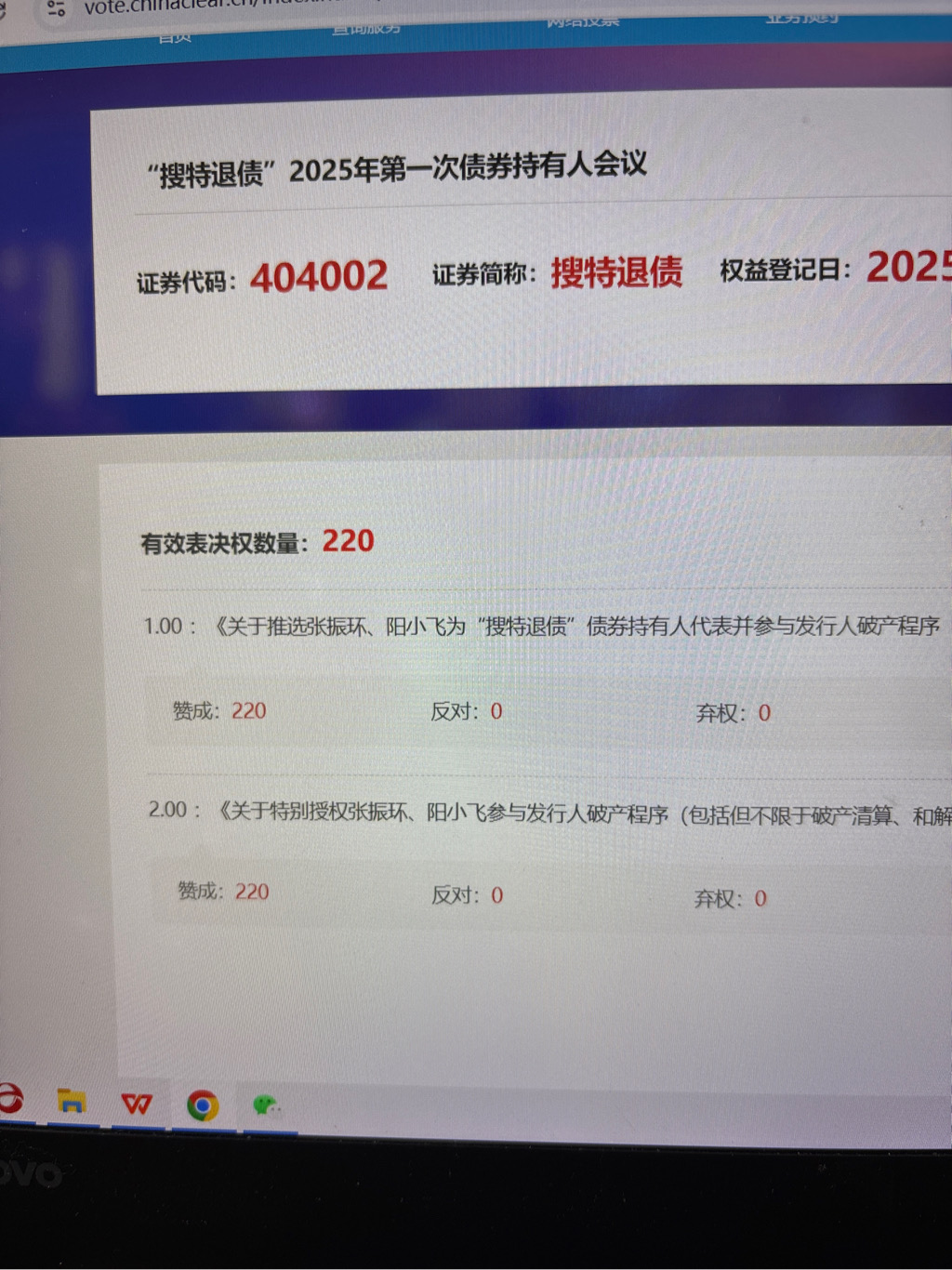 12月份的搜于特破产清算第一次债权人会议现在大家都了解了,在一债会召开前,我们积极团结所有持有人,以避免搜特转债持有人利益受损, 我们最小化了推选代表的授权范围,明确不可签署或同意任何“可能贬损本息总额及转股权利的议案” ,首先公募债持有人会议推选代表,在最高法院司法解释有明确的支持,不能被拒绝,然后也时考虑让所有未曾谋面的3.5万多搜特转债持有人能够放心投赞成票,也能够快速通过他们的审核能给我们开会!