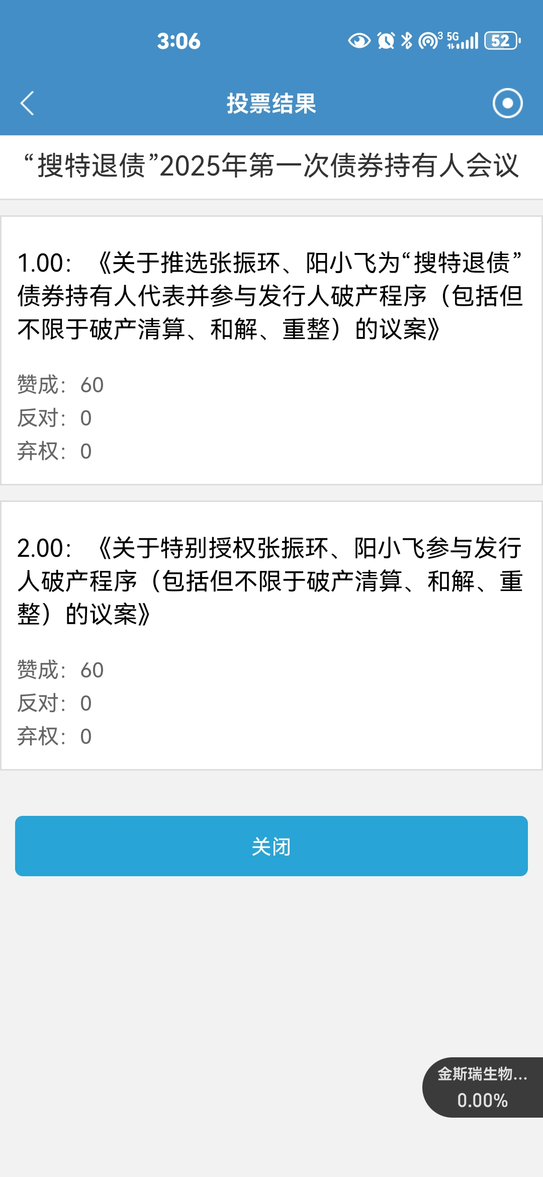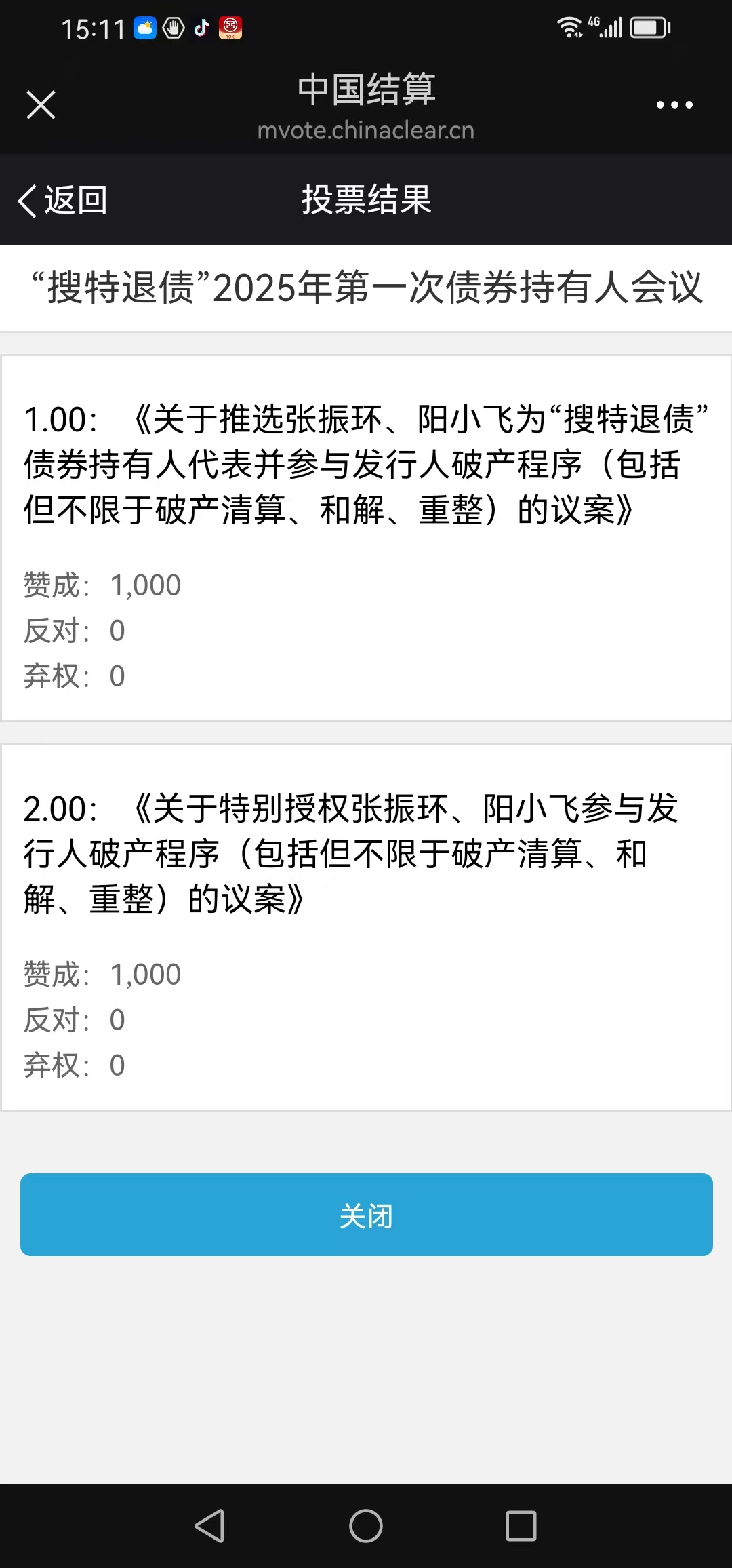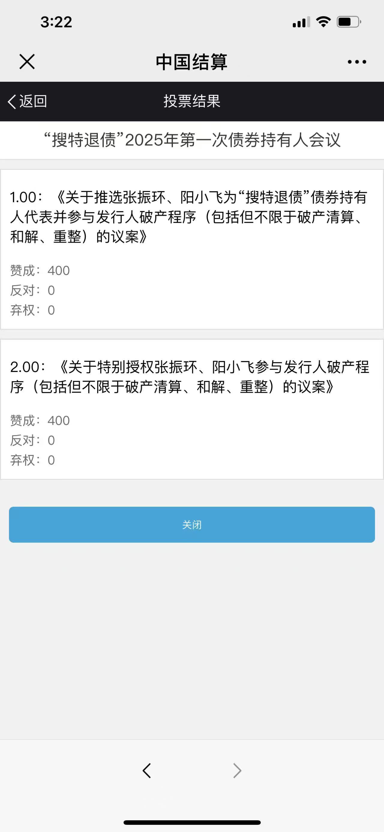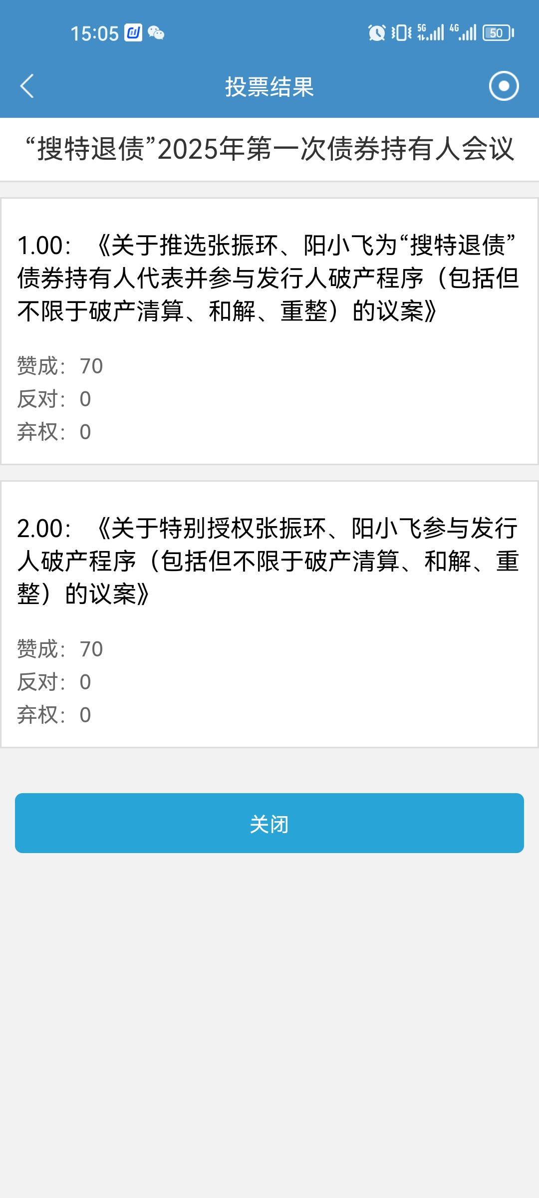 议案 1:《关于推选张振环、阳小飞为“搜特退债”债券持有人代表并参与 发行人破产程序(包括但不限于破产清算、和解、重整)的议案》