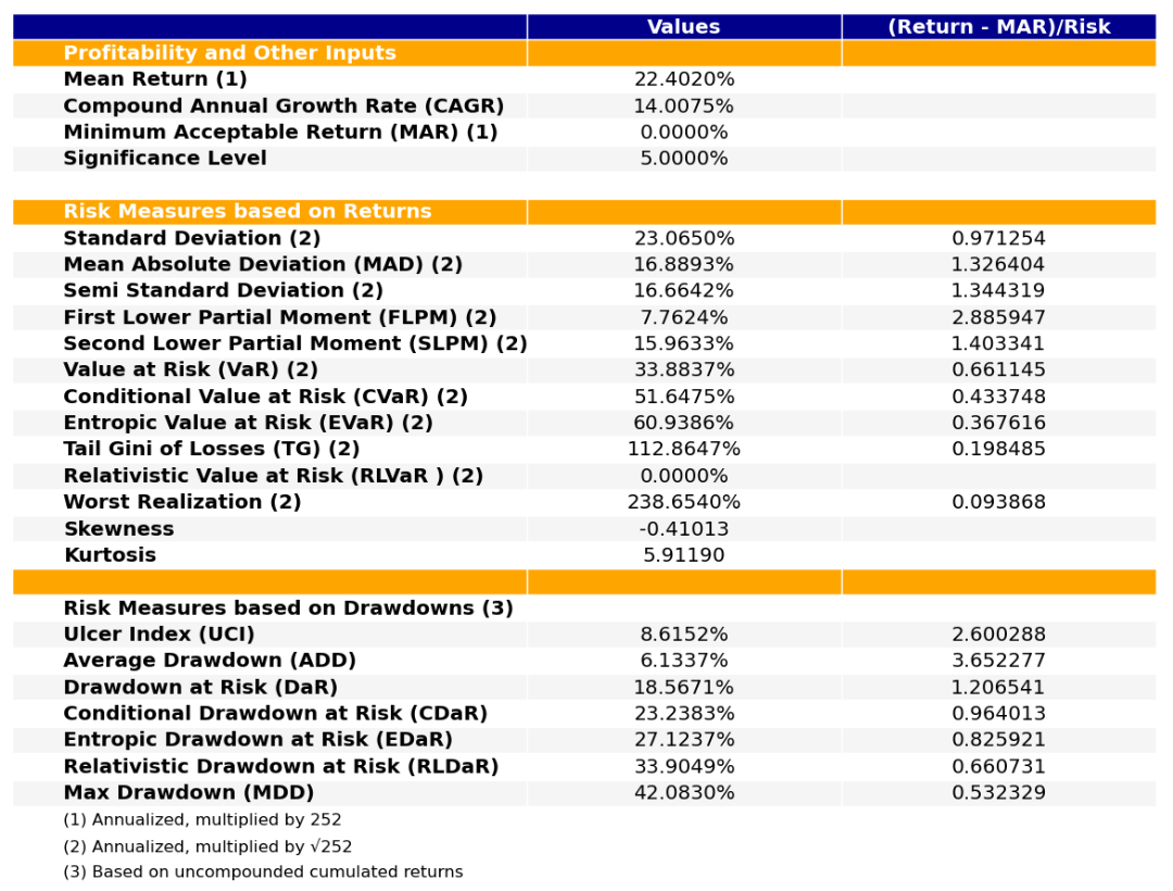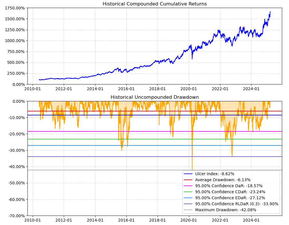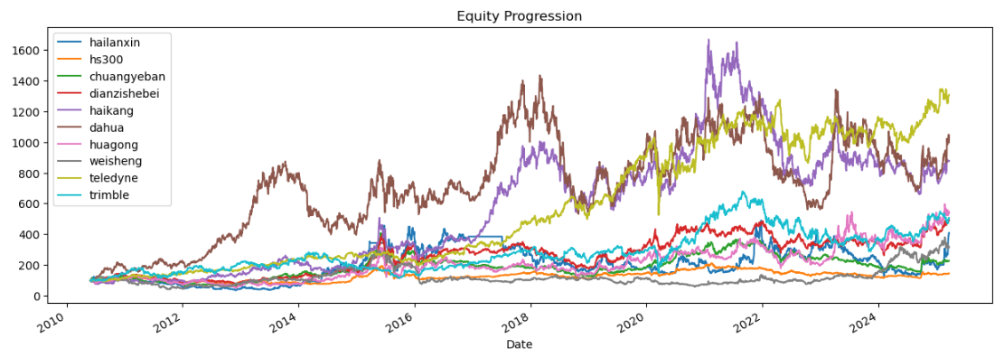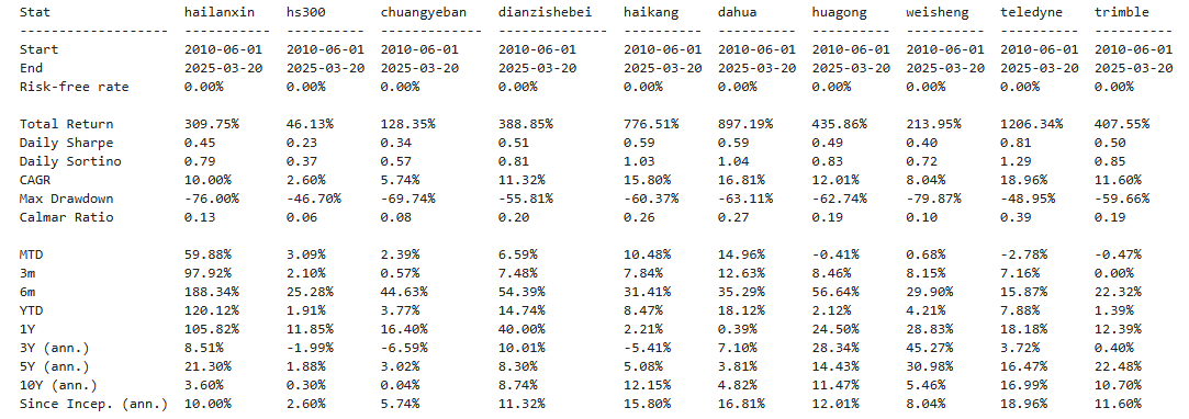 区间累计回报近18倍,最大回撤42.08%,投资组合的整体表现远好于海兰信个股。整个电子设备行业盈利能力还行,波动尚可,夏普比率1.07也算优秀了。(注:累计回报看Cumulative Returns那一栏,越高越好;最大回撤看Maximum Drawdown那一栏,越低越好)