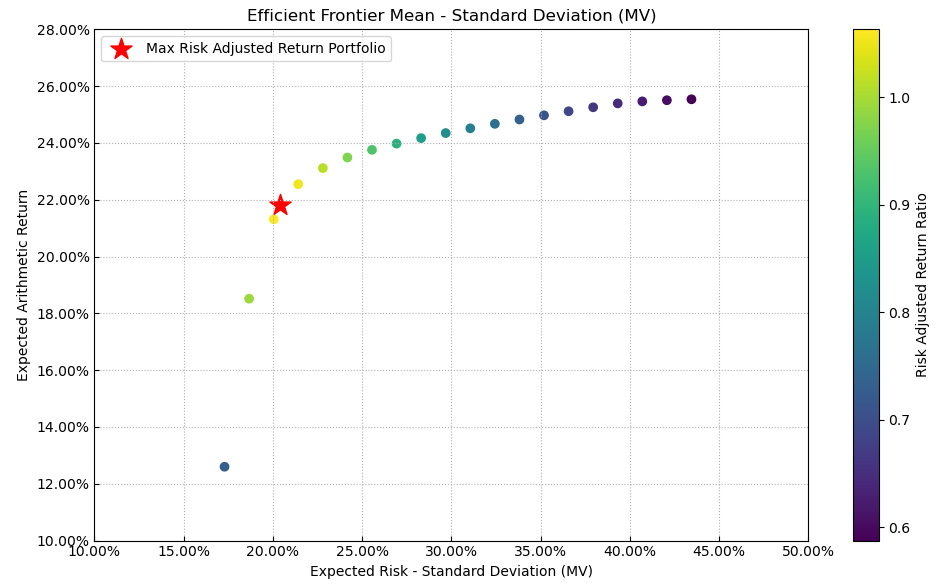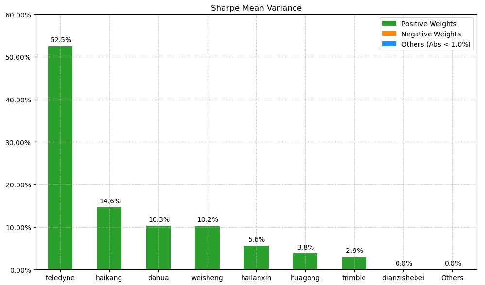按最高夏普比率配置的话,系统给的权重为5.6%,最大权重给了美股的TELEDYNE占比52.5%。(注:占比越高越好)