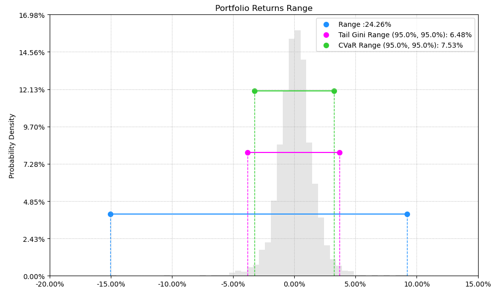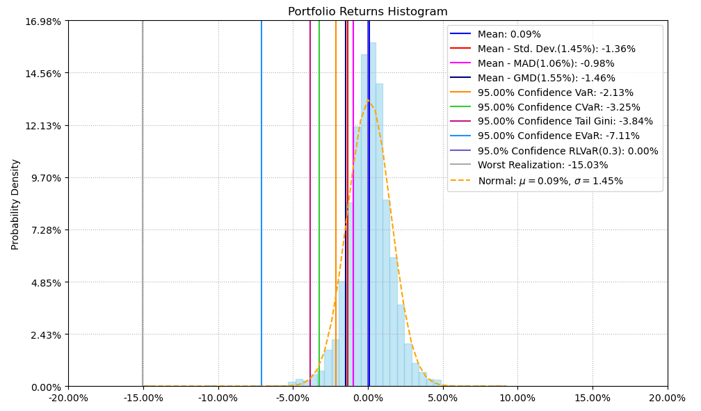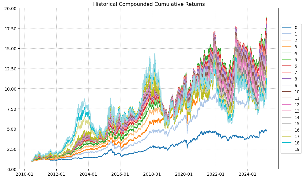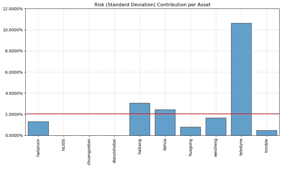 最后看下整个投资组合的情况,日度均值回报在0.09%,跟上次测的通信设备行业差不多,不过7.53%的CVaR波动会略大一些。(注:均值回报看Mean那一栏,越高越好;CVaR波动看CVaR那一栏,越低越好)