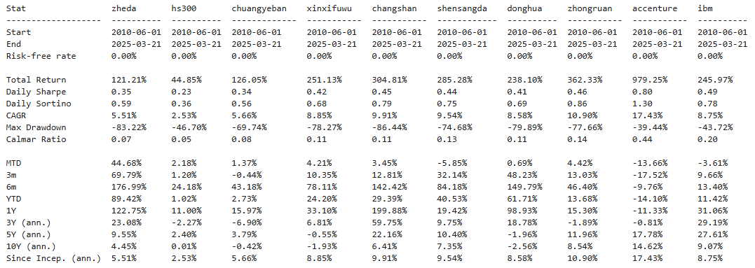区间累计回报近12倍,最大回撤31.36%,投资组合的整体表现远好于浙大网新个股。整个信息服务行业盈利能力不错,波动中低,夏普比率0.98也还行。(注:累计回报看Cumulative Returns那一栏,越高越好;最大回撤看Maximum Drawdown那一栏,越低越好)