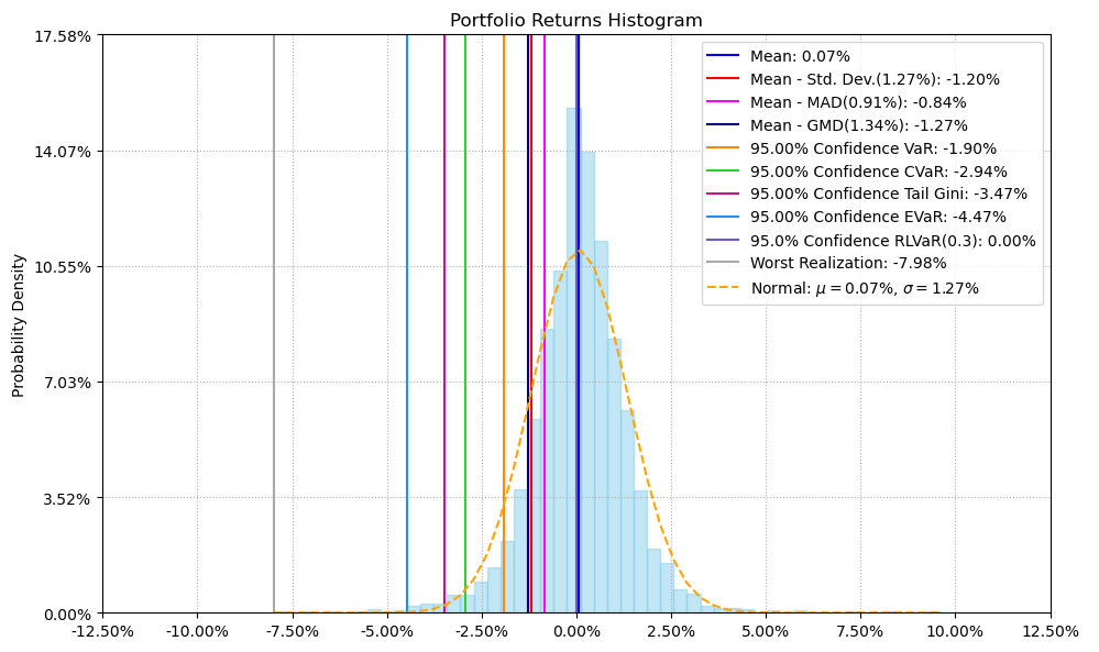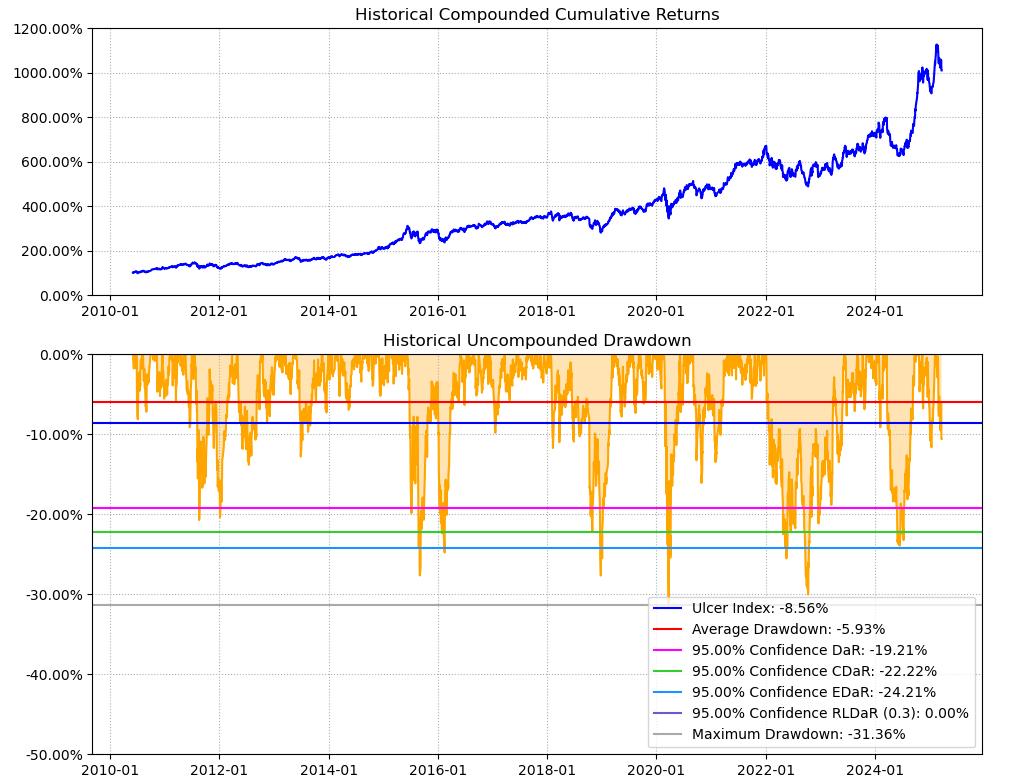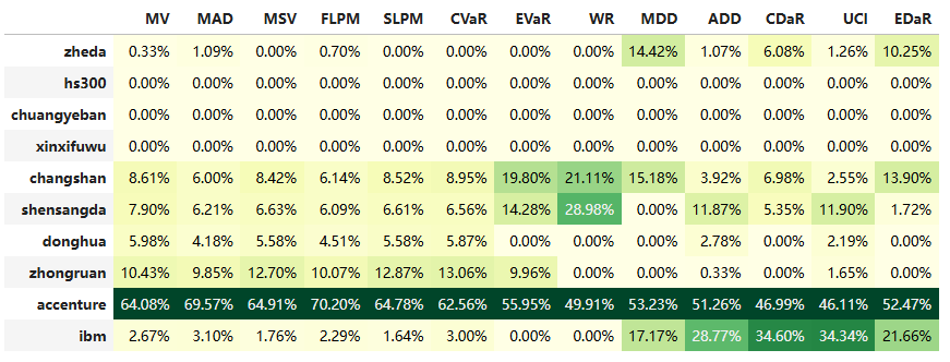 最后看下整个投资组合的情况,日度均值回报在0.07%,比上次测的电子设备行业低20%,不过6.82%的CVaR波动也会小一些。(注:均值回报看Mean那一栏,越高越好;CVaR波动看CVaR那一栏,越低越好)