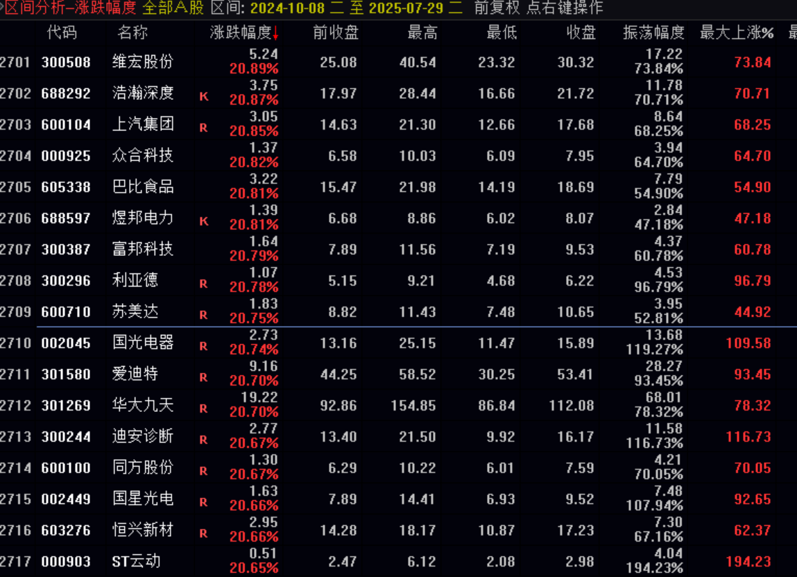 区间2024年10月8日--2025年7月29日两市共5417只股票,排位中位数2709位(苏美达)涨幅20.75%。其中上涨的股票4296只。