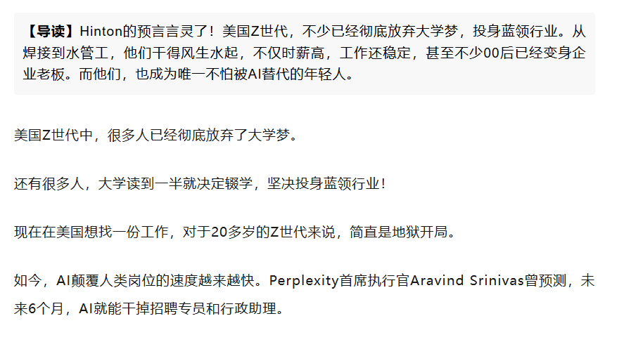 Hinton是“神经网络之父”他的观点也是我认同的,AI冲击下蓝领影响最小,在一个AI交流群里提到这个观点,基本大家都认同