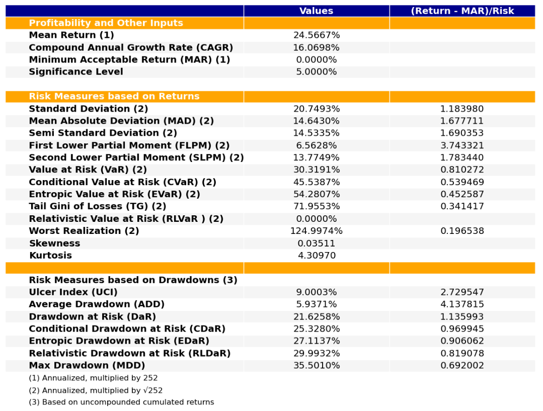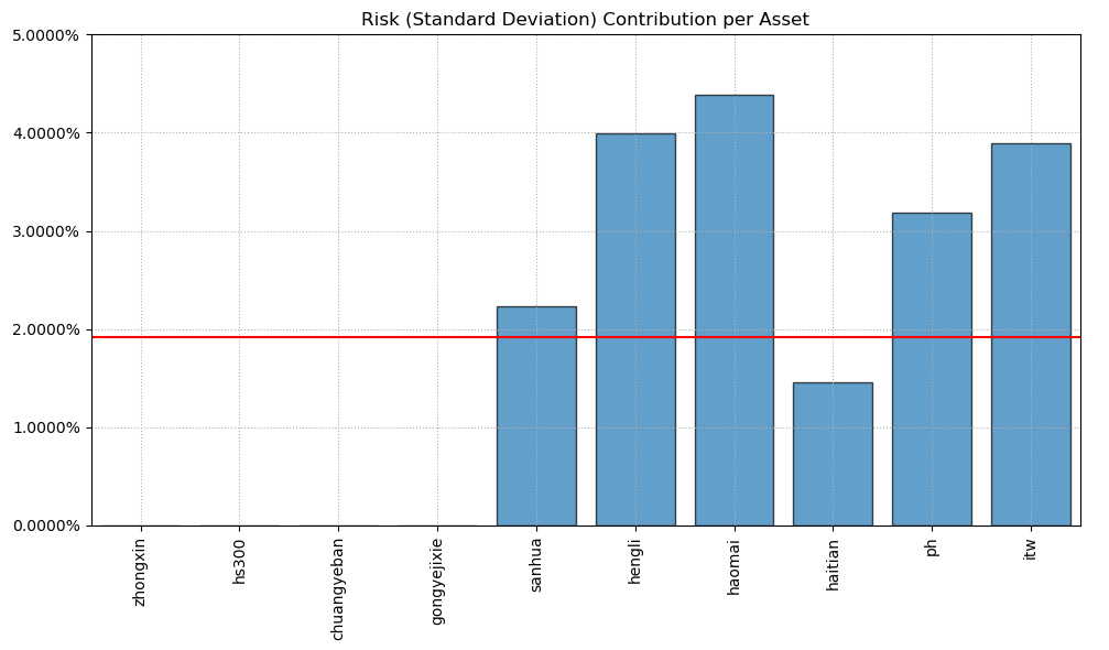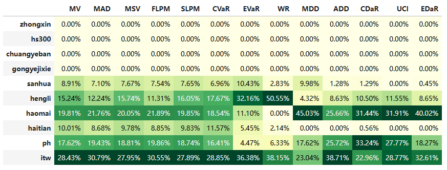 最后看下整个投资组合的情况,日度均值回报在0.10%,比上次测的机械重卡行业高40%,而且7.12%的CVaR波动还更低。(注:均值回报看Mean那一栏,越高越好;CVaR波动看CVaR那一栏,越低越好)