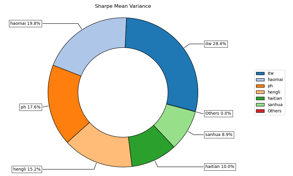 按最高夏普比率配置的话,系统给的权重为零,最大权重给了美股的伊利诺伊工具占比28.4%。(注:占比越高越好)