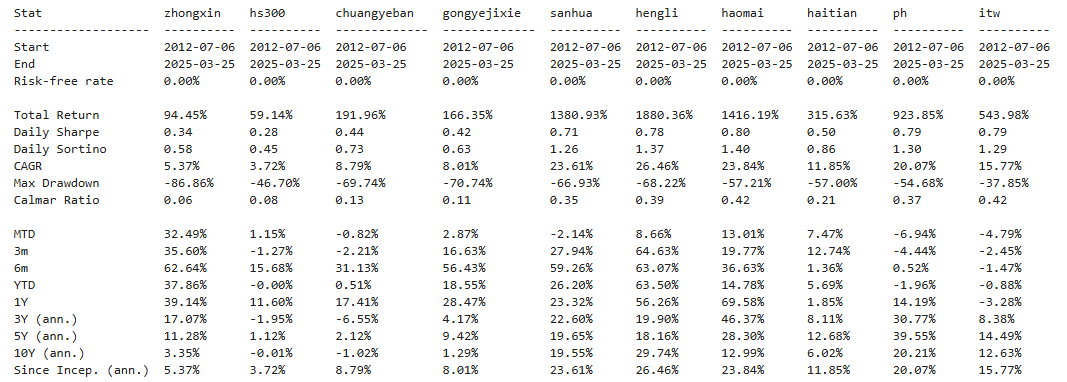 区间累计回报近18倍,最大回撤35.5%,投资组合的整体表现远好于中信重工个股。整个工业机械行业盈利能力优秀,波动中低,夏普比率1.29极具竞争力。(注:累计回报看Cumulative Returns那一栏,越高越好;最大回撤看Maximum Drawdown那一栏,越低越好)