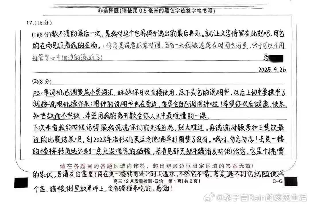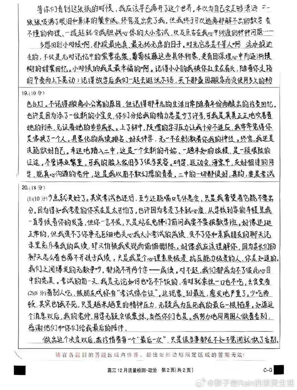 刚看到有一个悲伤的帖子,她把遗言写在答题卡上,以错误的方式结束了最后一场考试看了前面一段就泪目看不下去了。激娃可以,总得有个限度。可以激一激自己,多赚些钱留给孩子,孩子也可以少吃点苦。